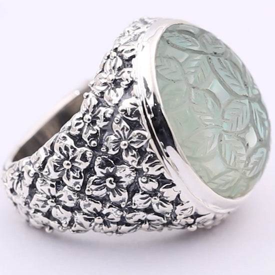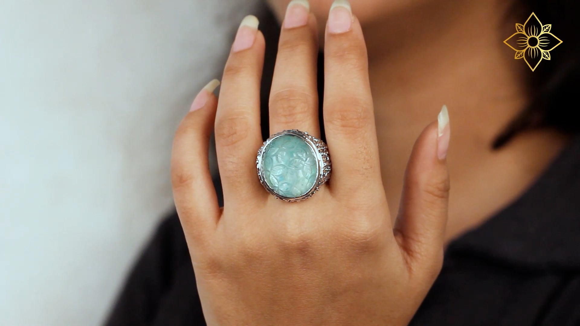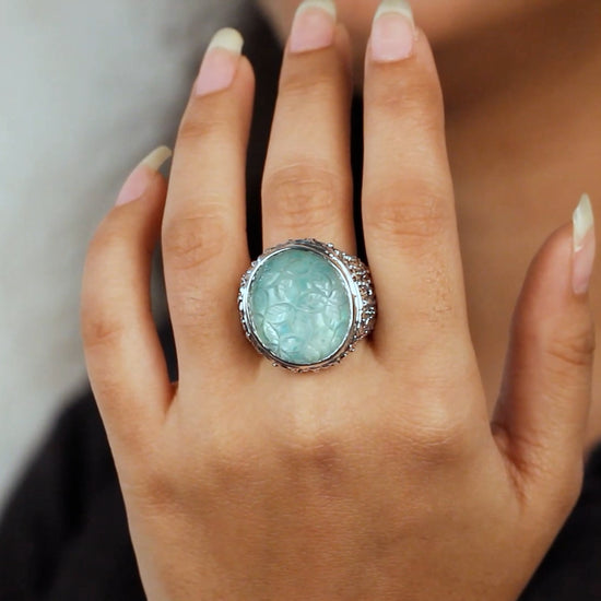 Carventurous Hand Carved Natural Quartz and Mother of Pearl Ring in Sterling Silver