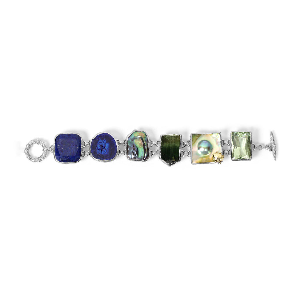 One of a Kind Blue Topaz, Azurit, Blue Peacock,Tourmaline Rough, Blister Pearl and Green Amethyst Facet Bracelet in Sterling Silver with 18K Gold Adam Bug