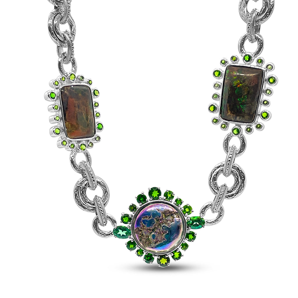 One of a Kind Ammolite Opal Druzy Chrome Diopside and Green Tourmaline Necklace in Sterling Silver