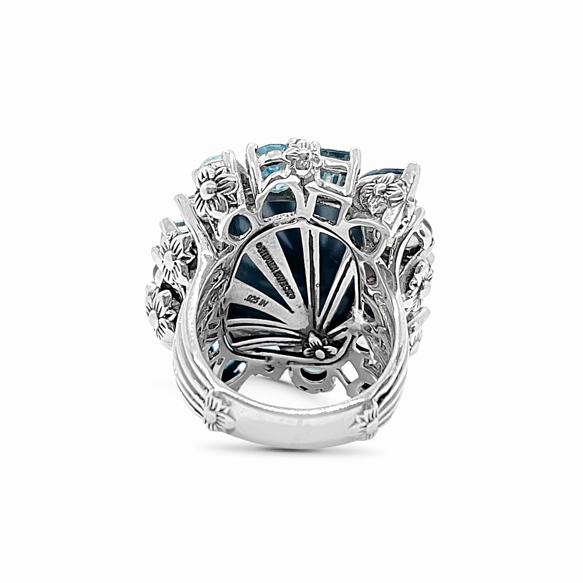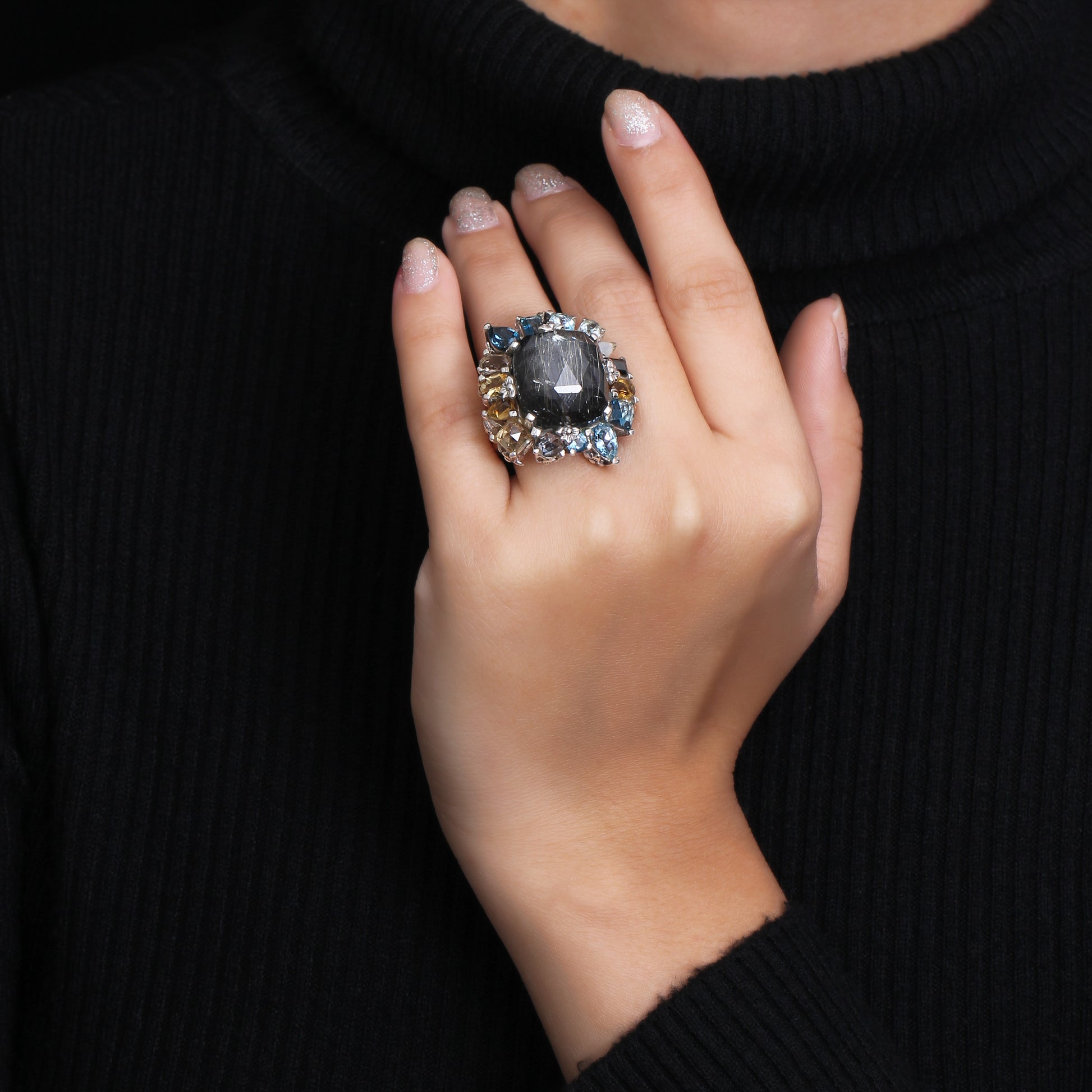 Rockrageous Gold Hair Rutilated Quartz Hematite Sky Swiss and London Blue Topaz Cognac Whiskey and Smoky Quartz Ring in Sterling Silver