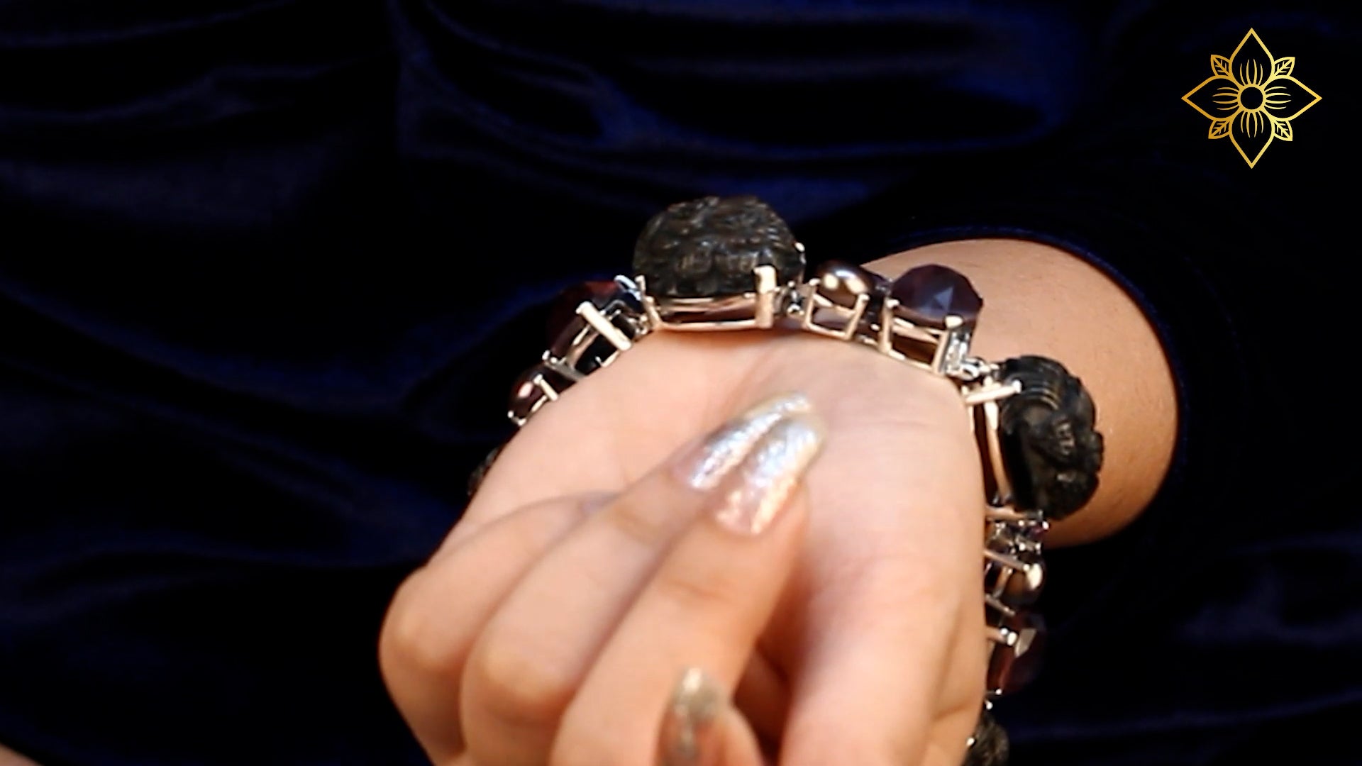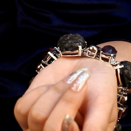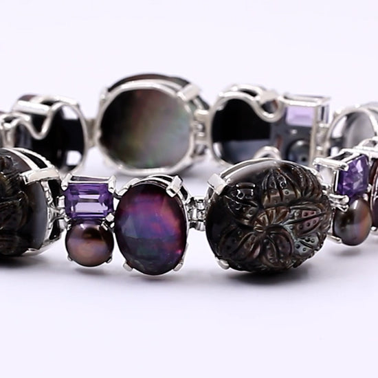 Hand Carved Black Tahitian Mother of Pearl Amethyst Pearls Natural Quartz and Plum Tint Mother of Pearl Bracelet in Sterling Silver