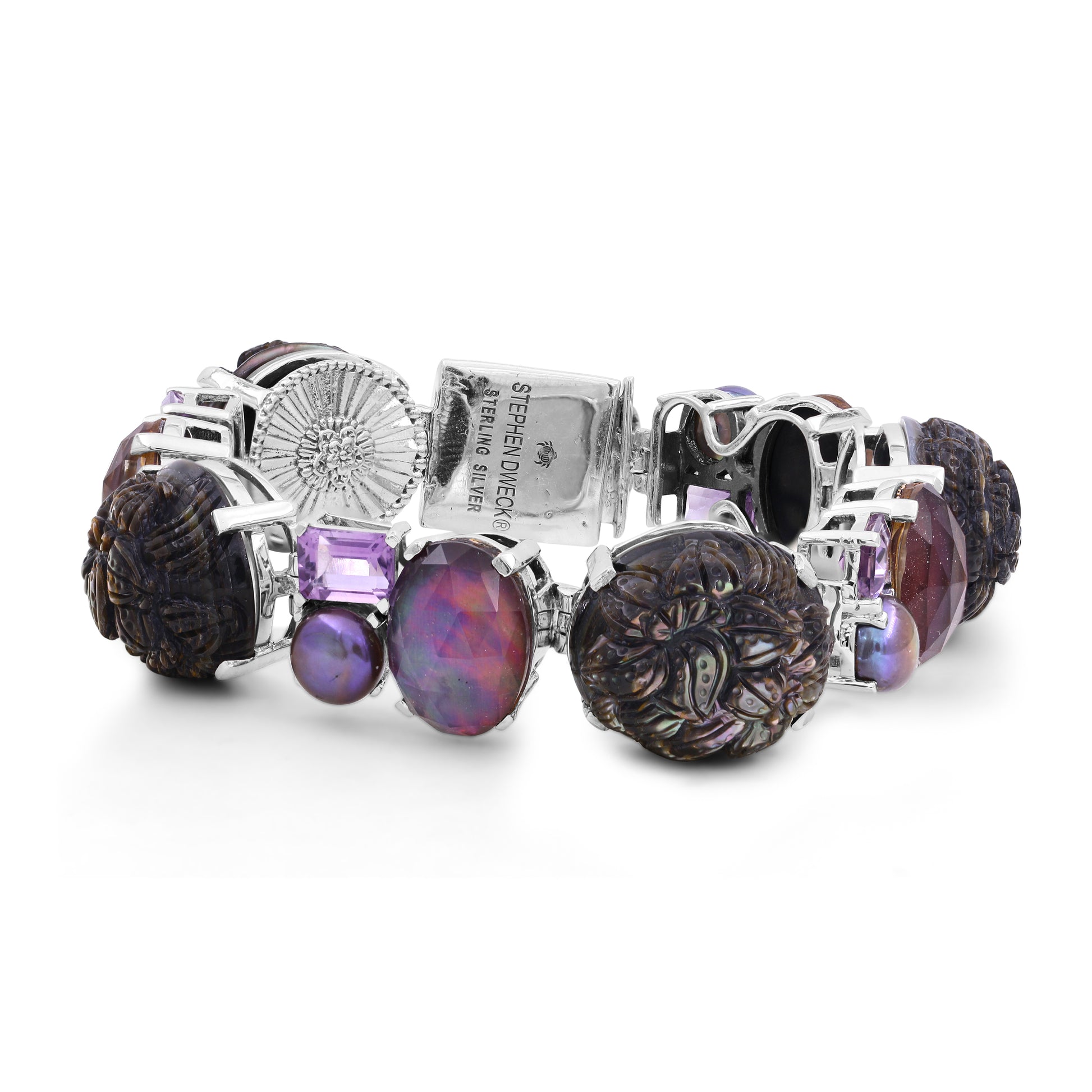 Hand Carved Black Tahitian Mother of Pearl Amethyst Pearls Natural Quartz and Plum Tint Mother of Pearl Bracelet in Sterling Silver