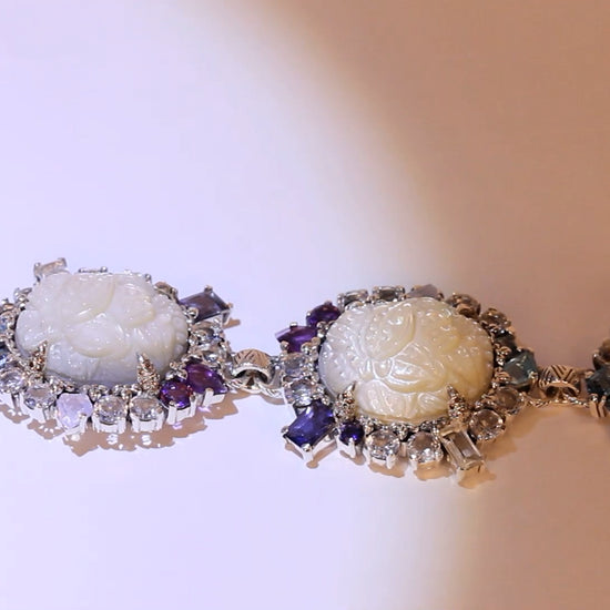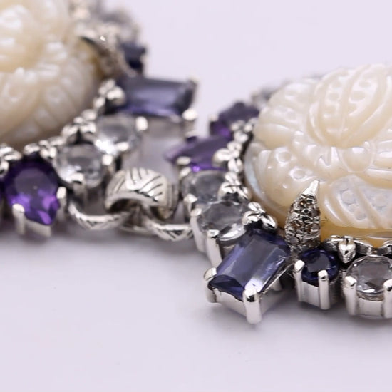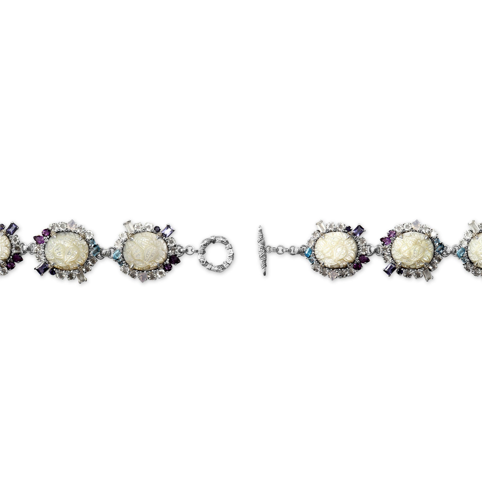 Carventurous Hand Carved Mother of Pearl Lavender Moon Quartz Amethyst Iolite Blue and White Topaz Bracelet in Sterling Silver