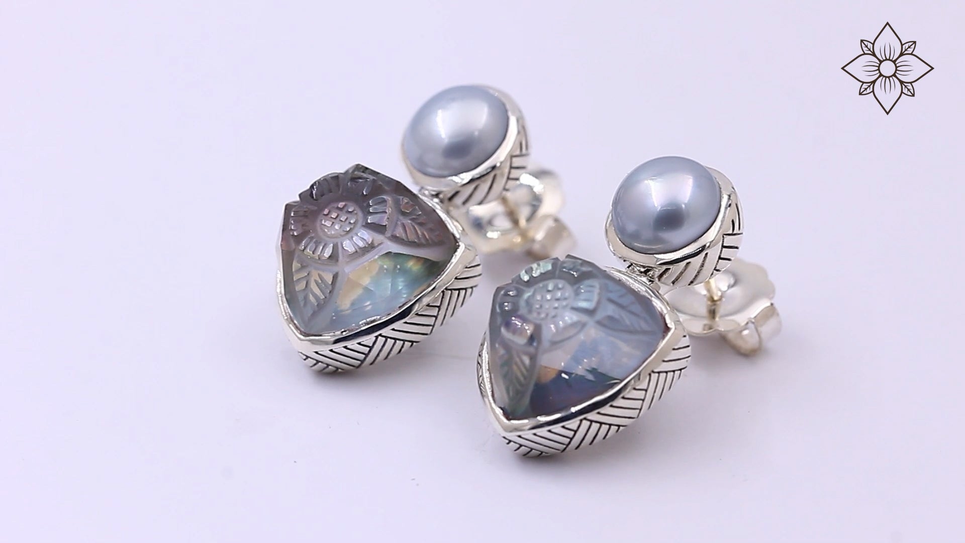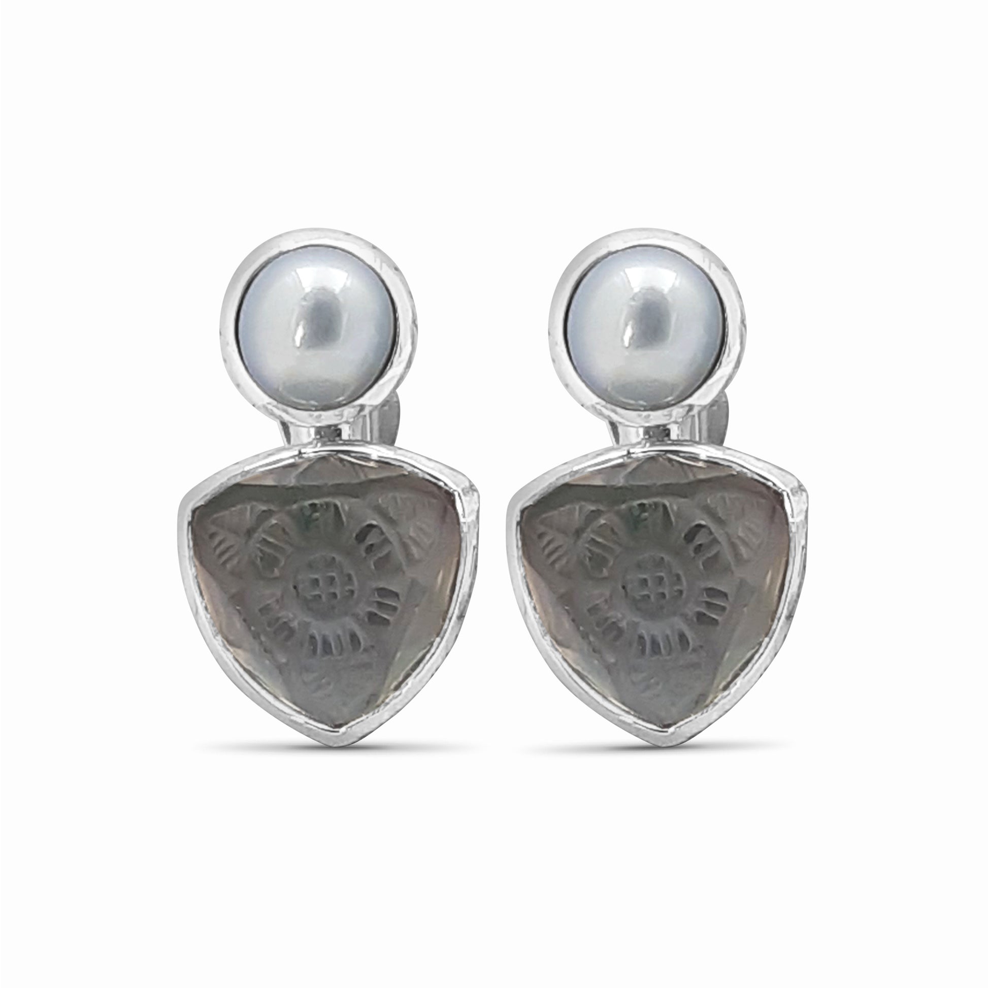 Carventurous Silver Pearl Hand Carved Natural Quartz and Mother of Pearl Clip Earrings in Sterling Silver