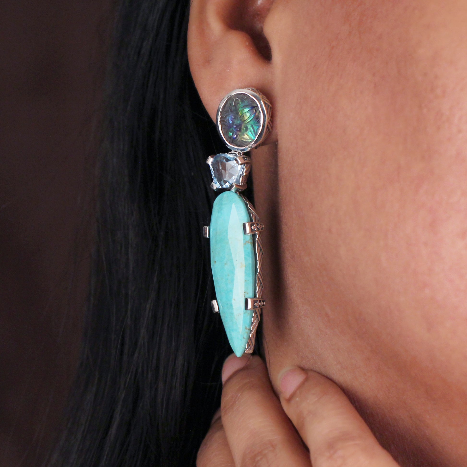Carventurous Hand Carved Natural Quartz Abalone Faceted Blue Topaz and Faceted Turquoise Earrings in Sterling Silver