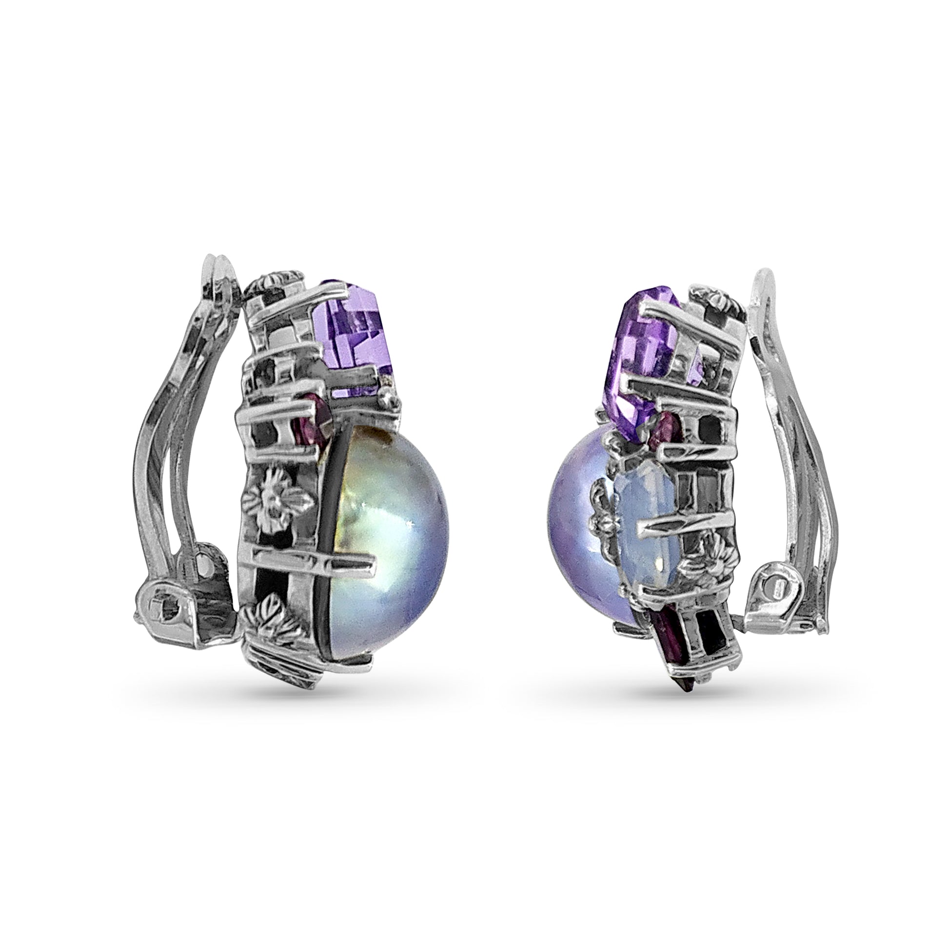Rockrageous Amethyst Rhodolite Garnet Pink Tourmaline Lavender Moon Quartz and Mabe Pearl Clip Earrings in Sterling Silver