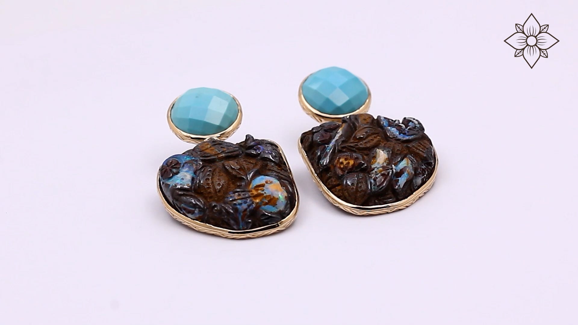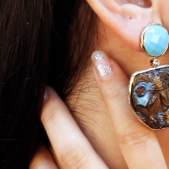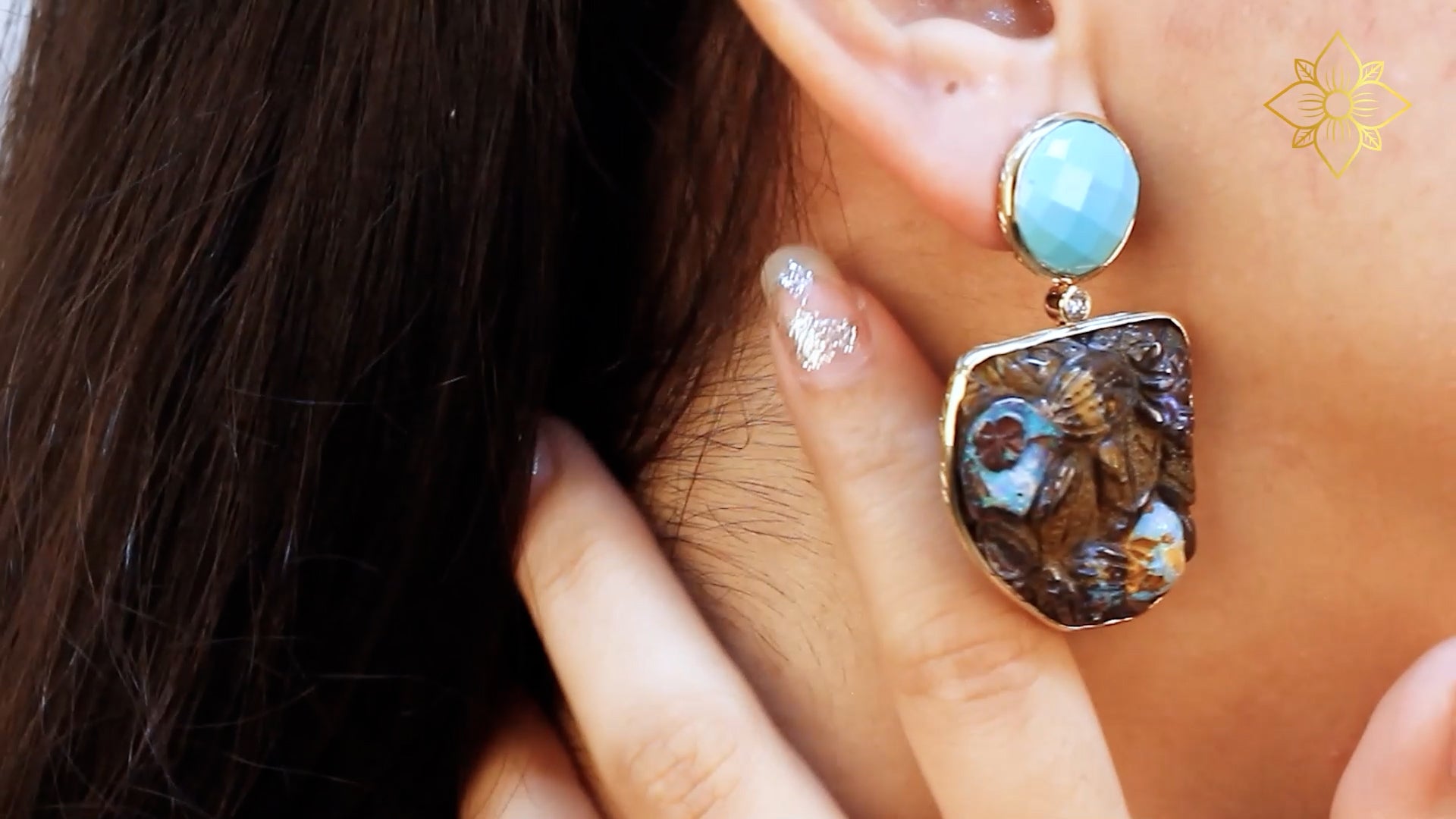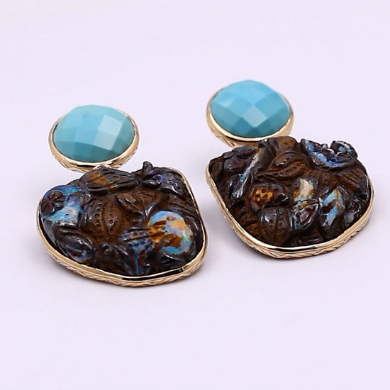 Luxury Turquoise Hand Carved Boulder Opal and Diamond 0.20ct Earrings in 18K Gold
