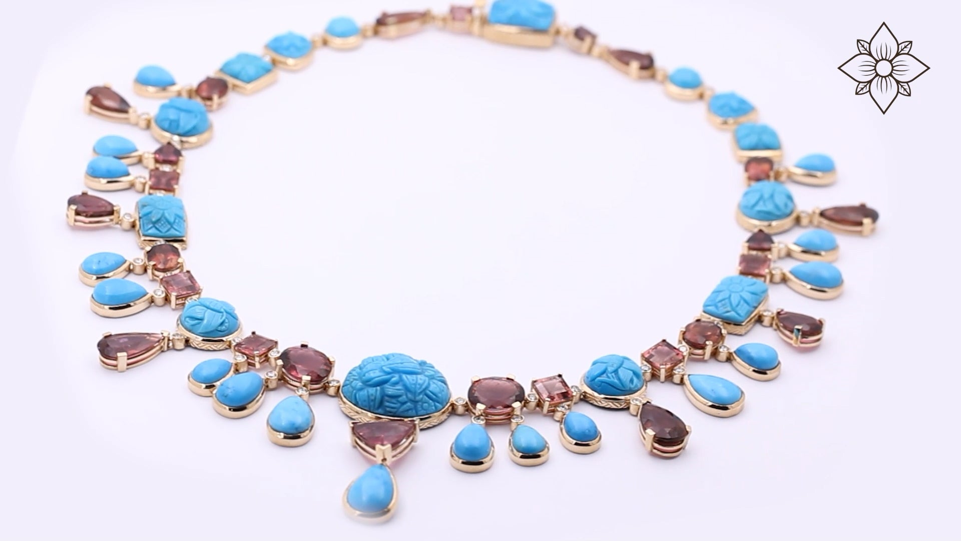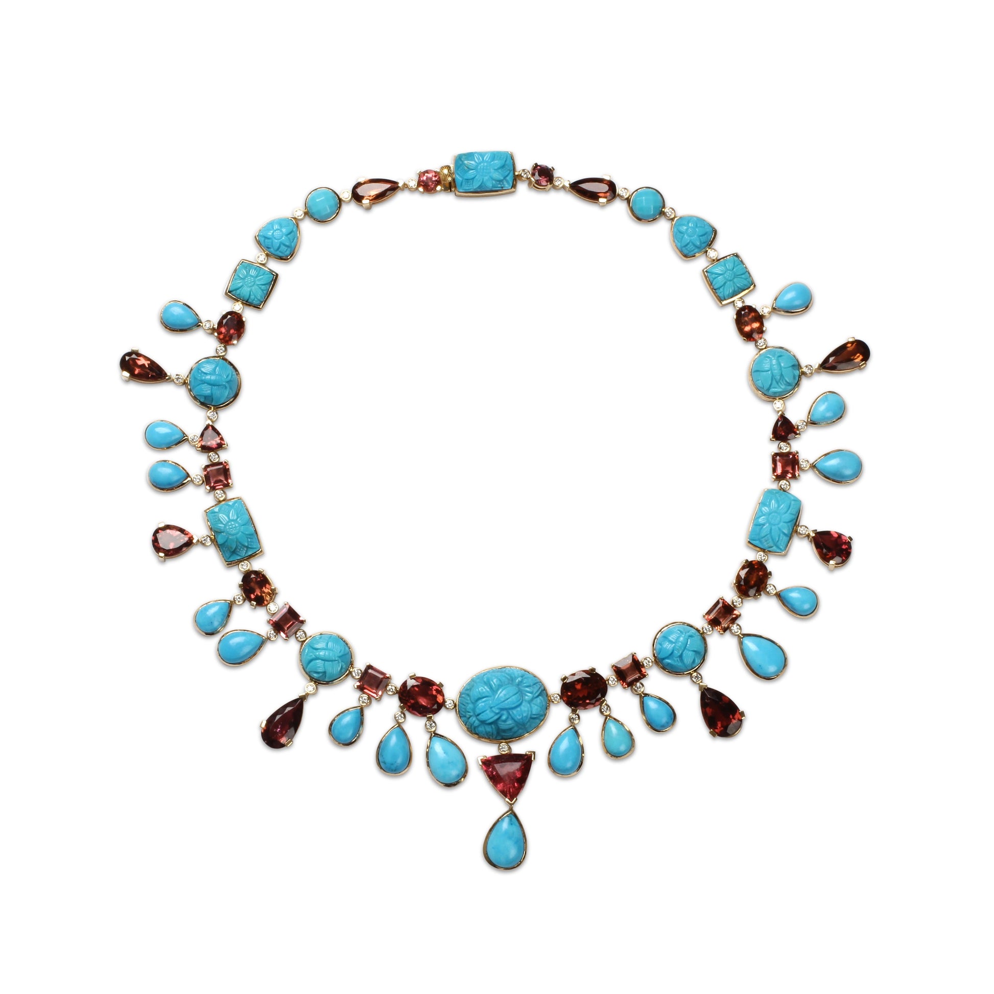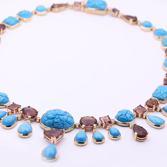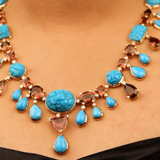 Luxury Hand Carved and Sleeping Beauty Turquoise 137ct Pink Tourmaline 64ct and Diamond 2.60ct Necklace in 18K Gold