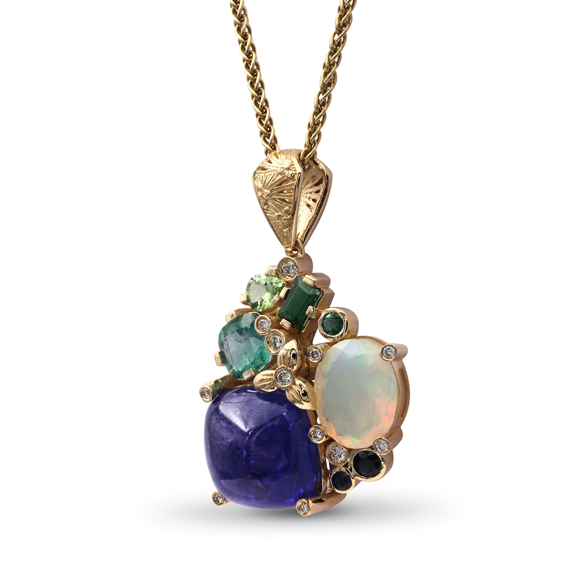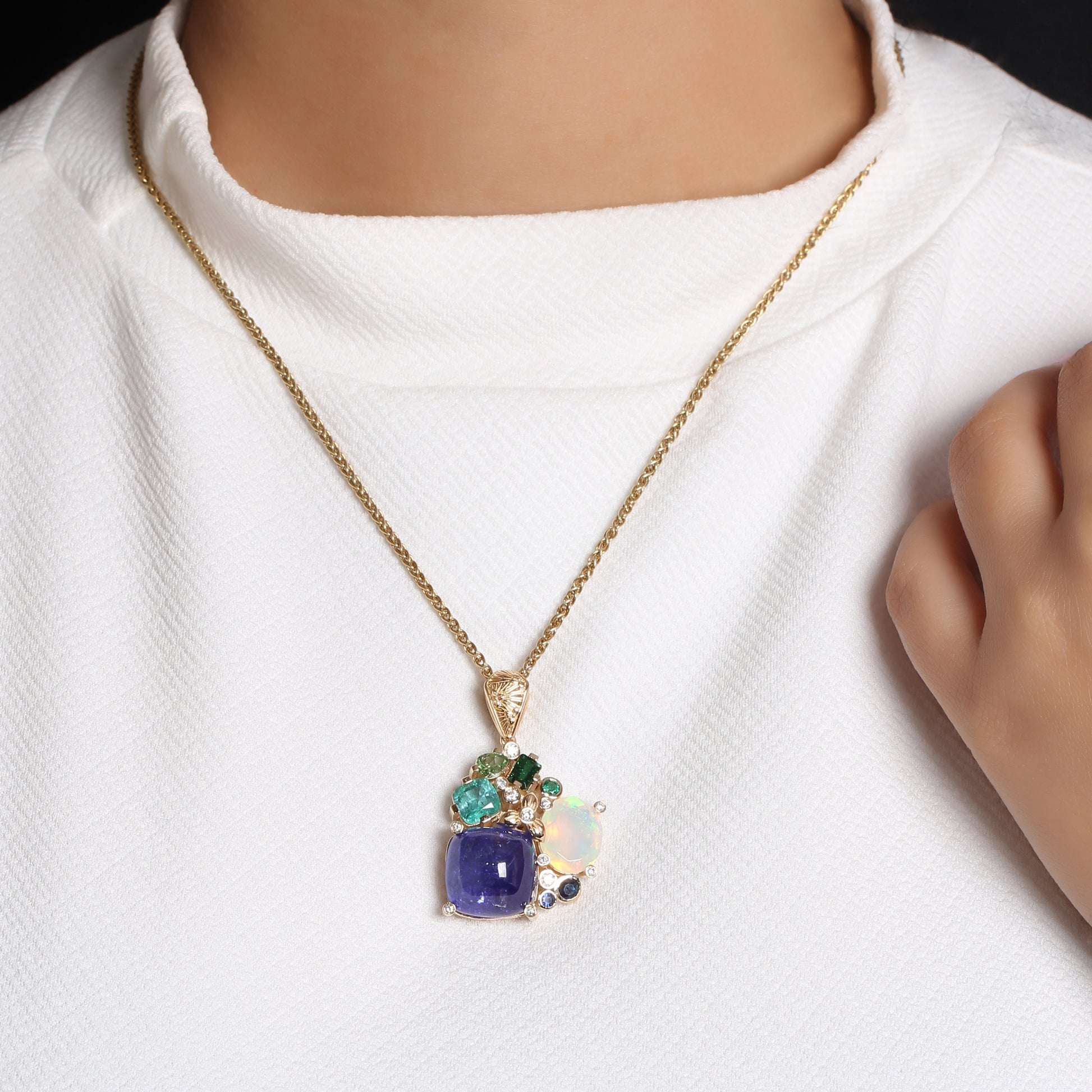 Luxury Tanzanite 17.2ct Opal 2.75ct Emerald 1.3ct Blue Sapphire Tsavorite Chrome Diopide and Diamond 0.20ct Pendant in 18K Gold