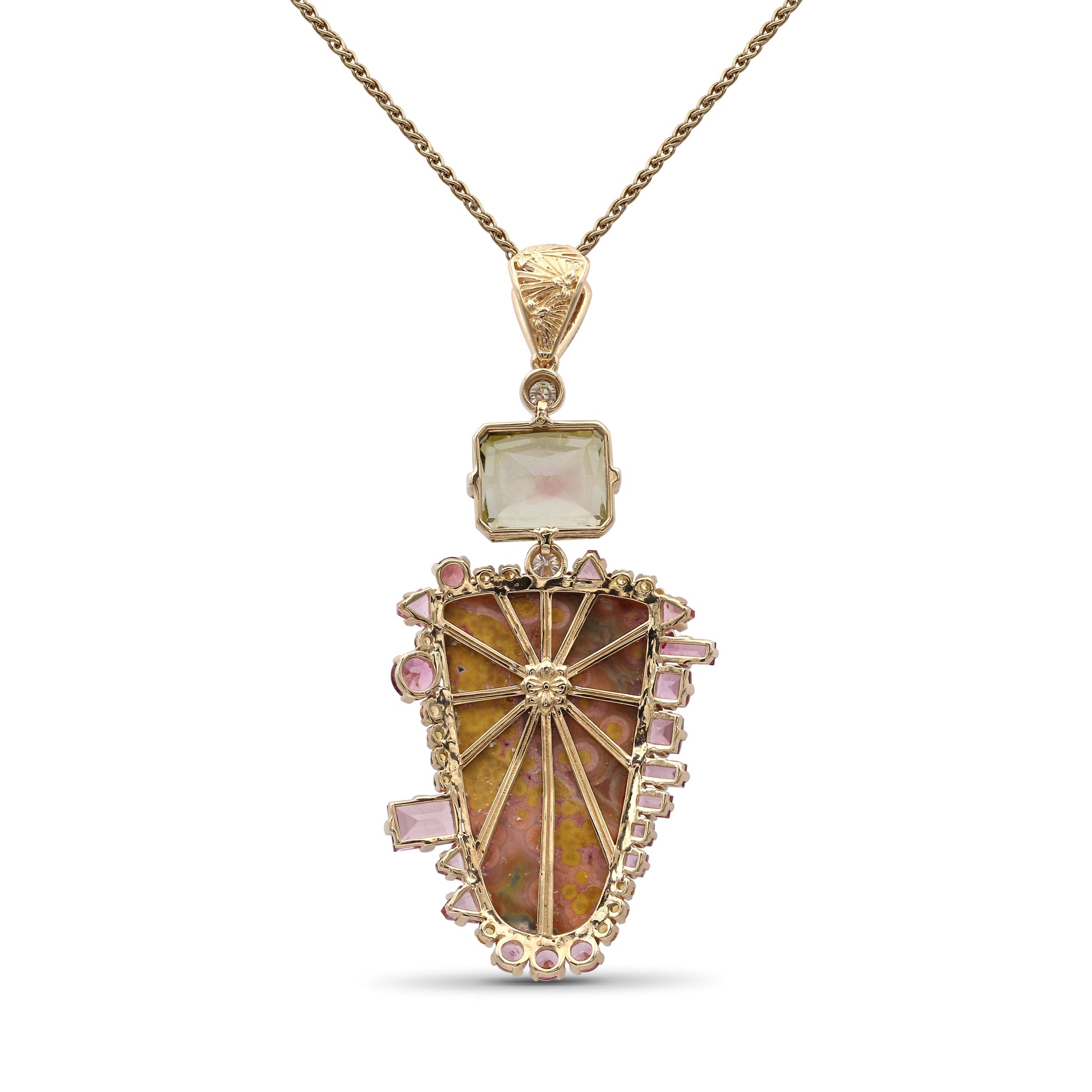 Luxury Hand Carved Sunset Jasper 34.3ct Bi-Color Tourmaline 6.7ct Yellow Sapphire 0.40ct Pink Tourmaline 2.8ct and Diamond 0.25ct Pendant in 18K Gold