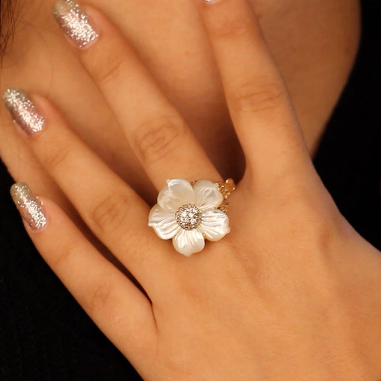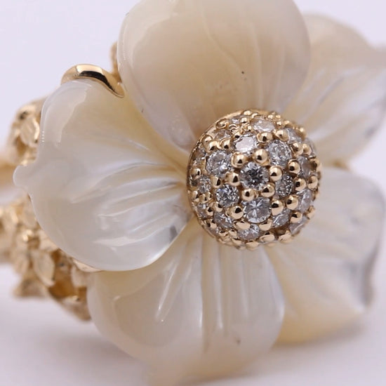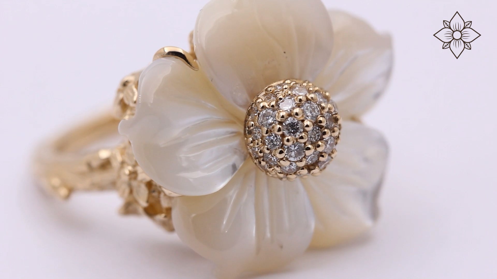 Luxury Hand Carved Mother of Pearl and Diamond 0.25ct Ring in 18K Gold