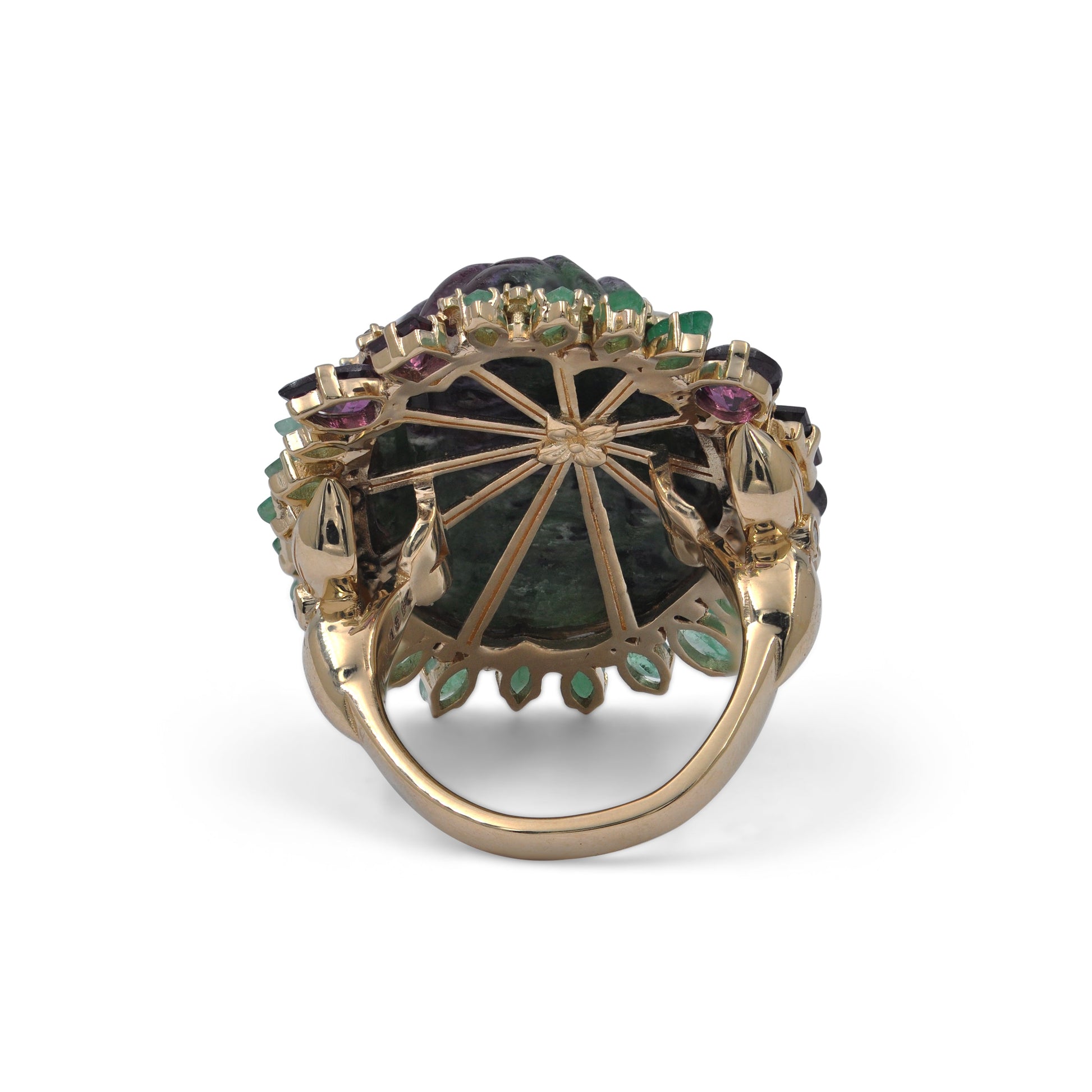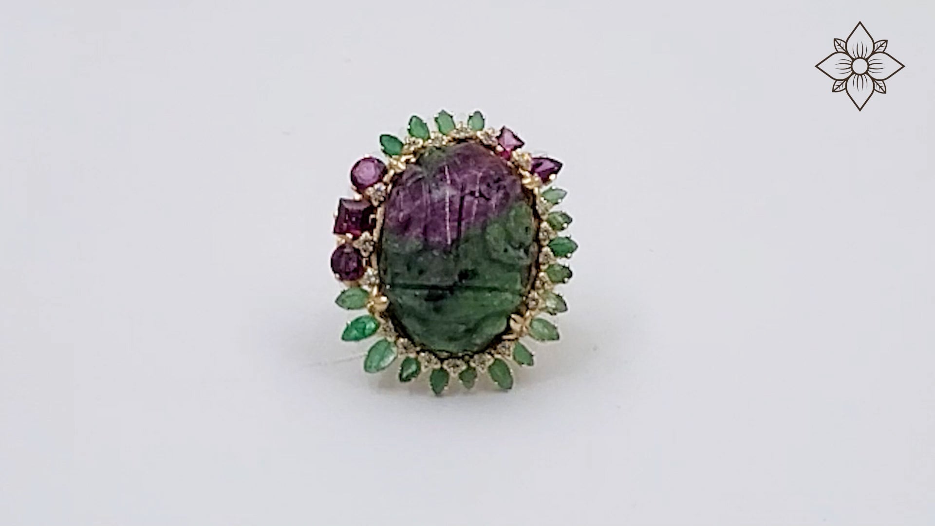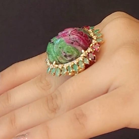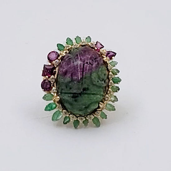 Luxury Hand Carved Ruby Zoisite 34ct Emerald Rhodolite Garnet and Diamond 0.25ct Ring in 18K Gold