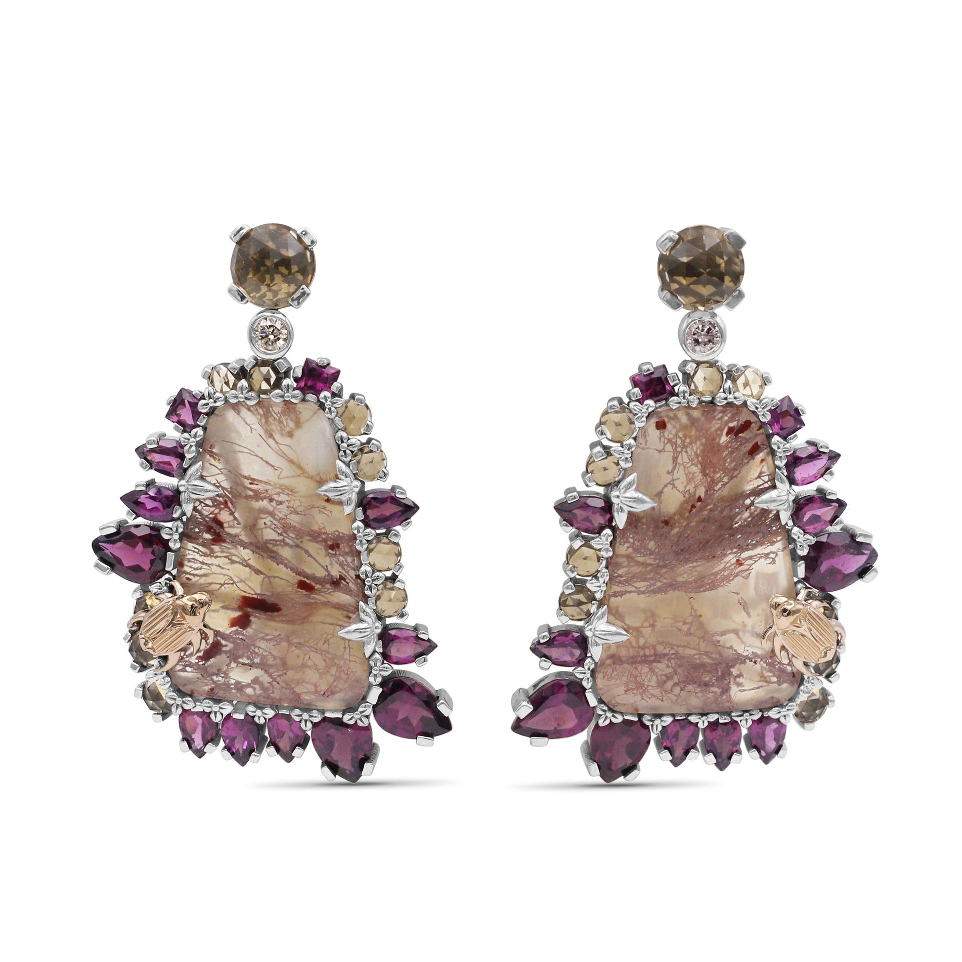 One of a Kind Whisky Quartz Rhodolite Garnet Rutilated Quartz and Champagne Diamond 0.20ct Earring in Sterling Silver with 18K Gold Adam