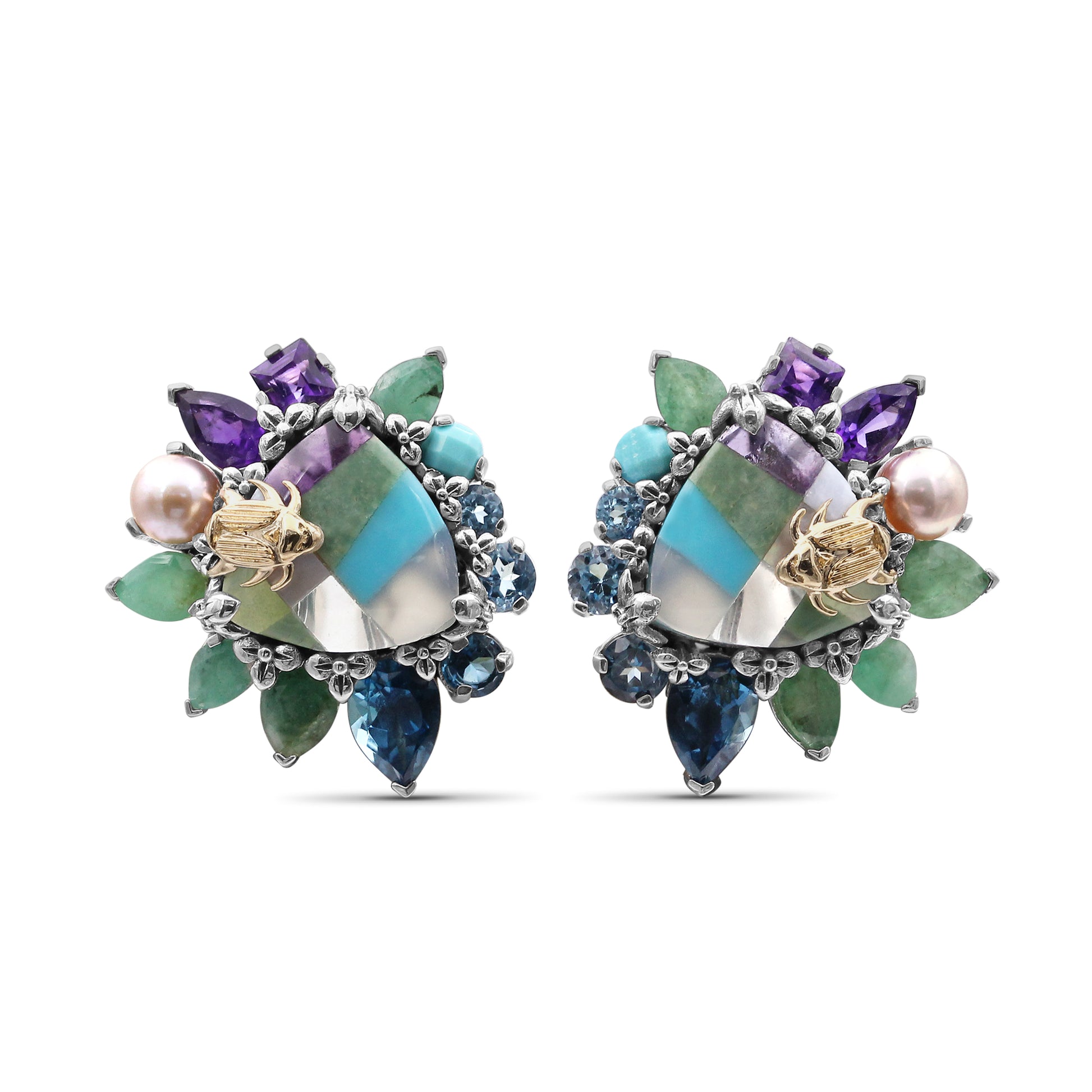 One of a Kind Swiss Blue Topaz Amethyst Facet Flat Back Blue Turquoise London Blue Topaz Natural Pearl Pastel Color Mosaic Facet Emerald and Diamond 0.04ct Earring in Sterling Silver with 18K Gold Adam