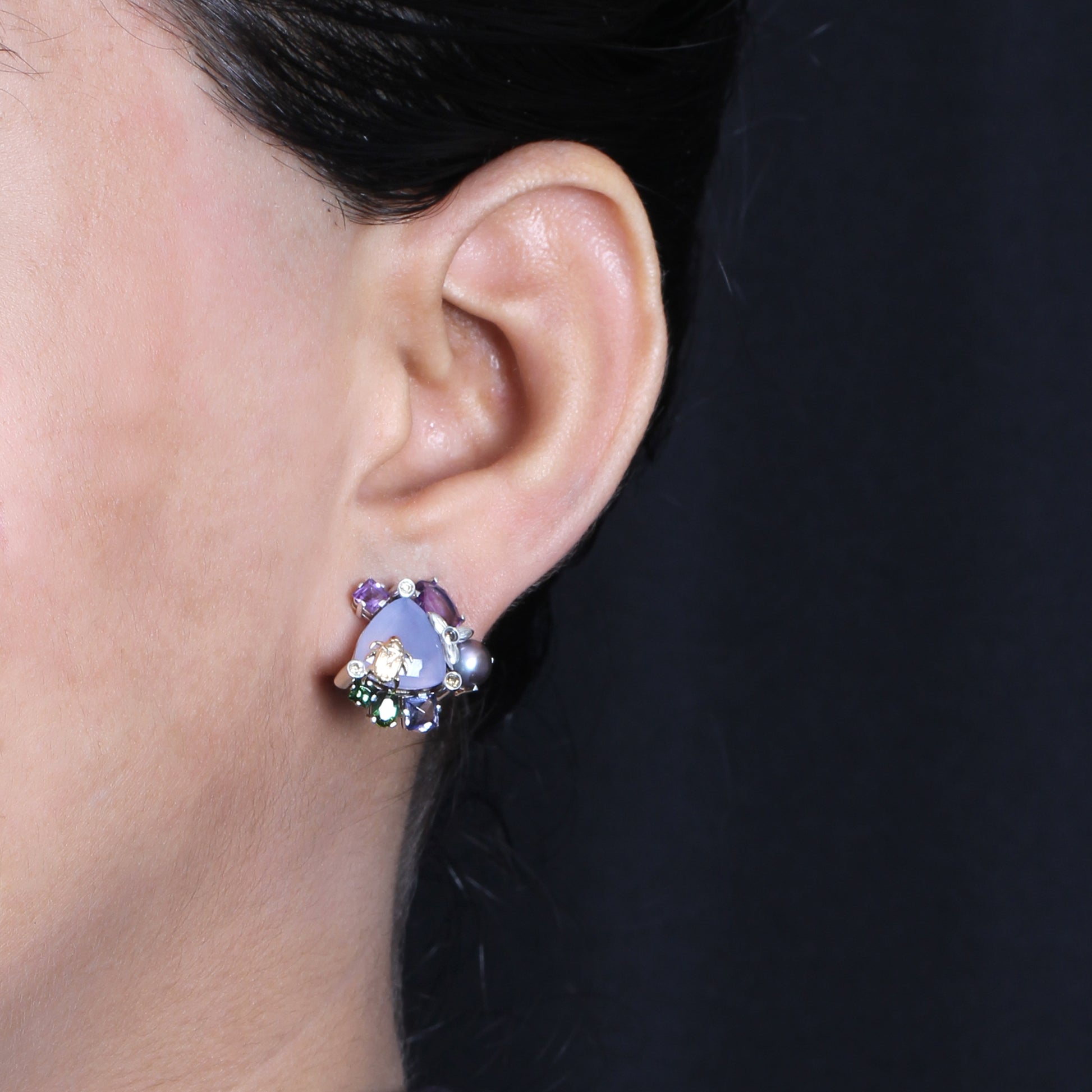One of a Kind Green Tourmaline Amethyst Blue Sapphire Lavender Pearl Blue Chalcedony and Diamond 0.08ct Earring in Sterling Silver with 18K Gold