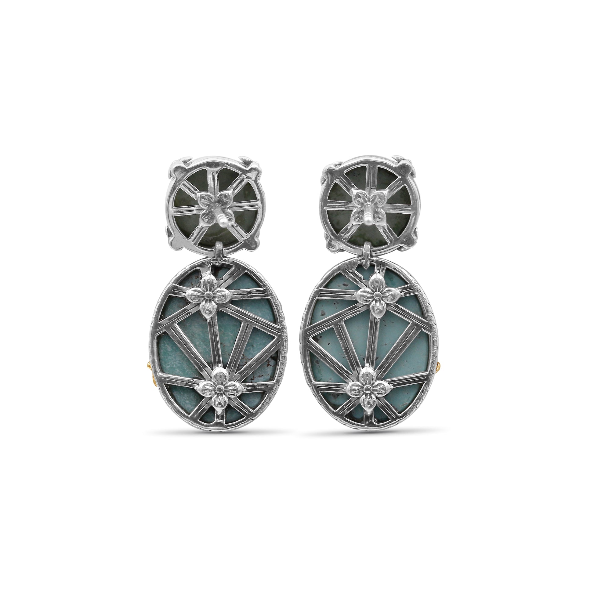 One of a Kind Top Facet Natural Quartz Over Green Turquoise and Smooth Green Turquoise Earring in Sterling Silver with 18K Gold Adam