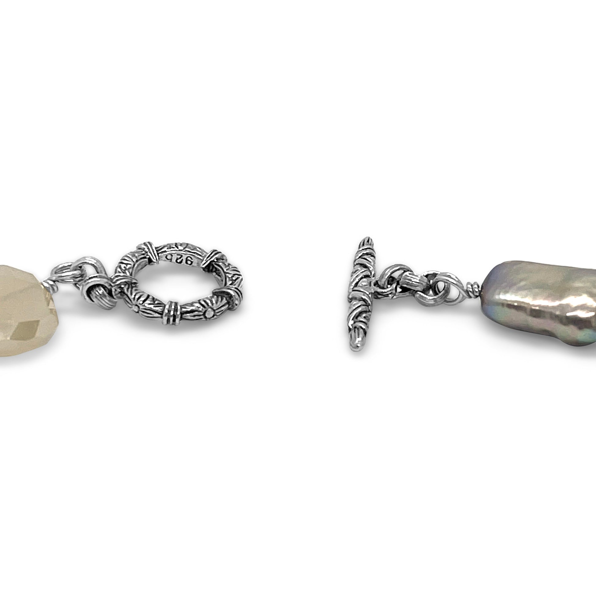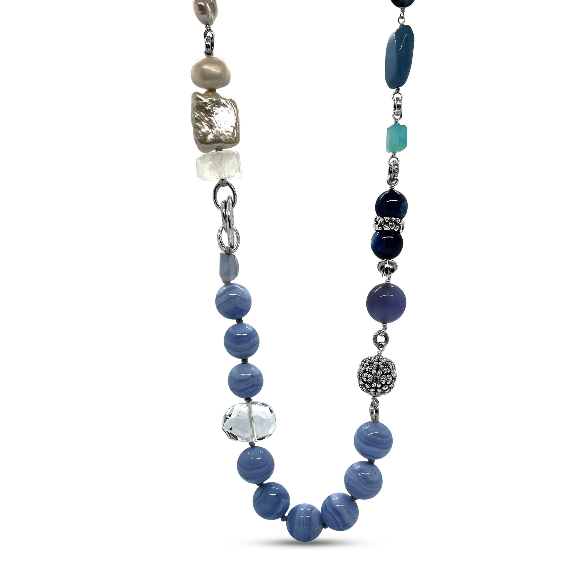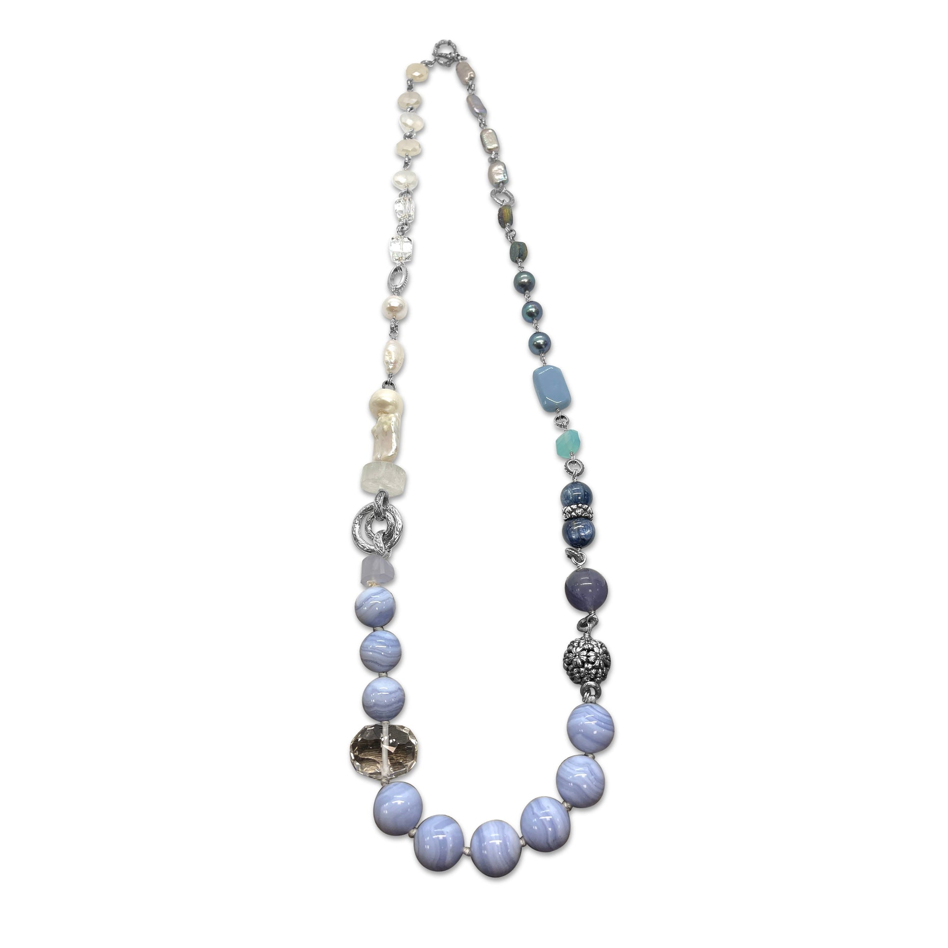 One of a Kind Blue Topaz Baroque Pearl Opal Kyanite Blue Lace Agate Fluorite Chalcedony Druzy and Natural Quartz Necklace in Sterling Silver