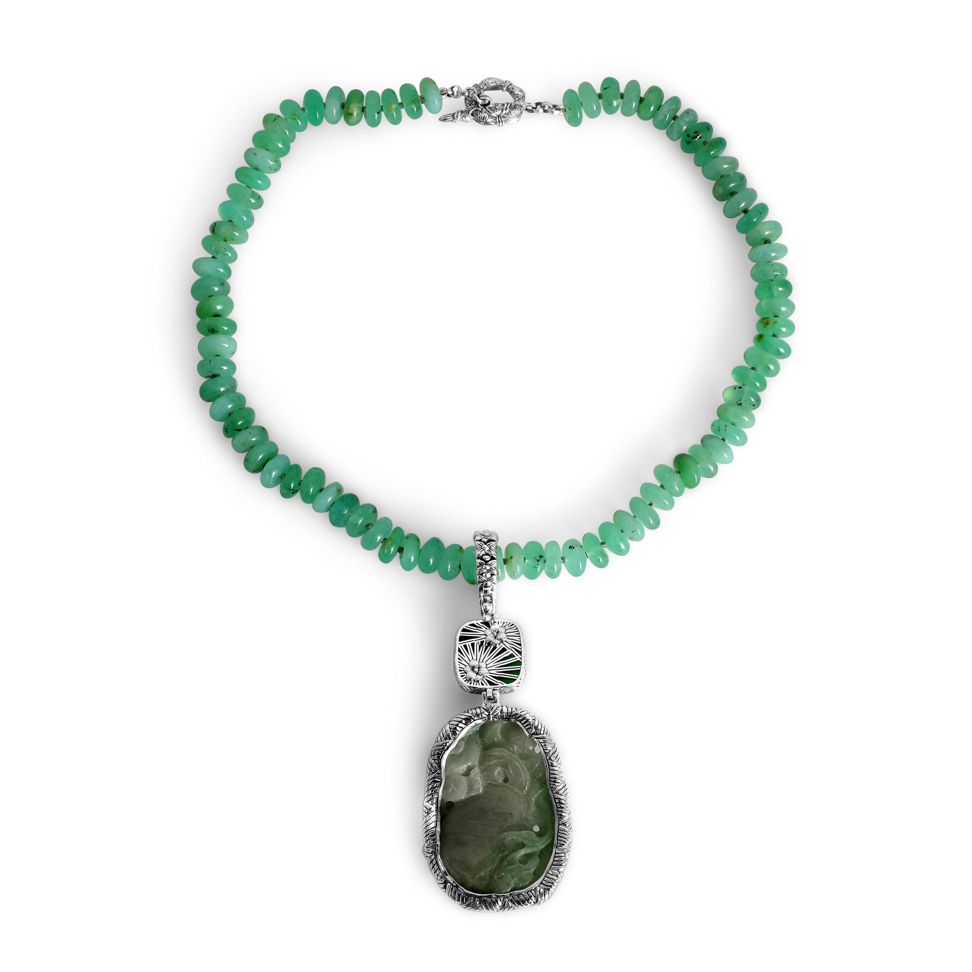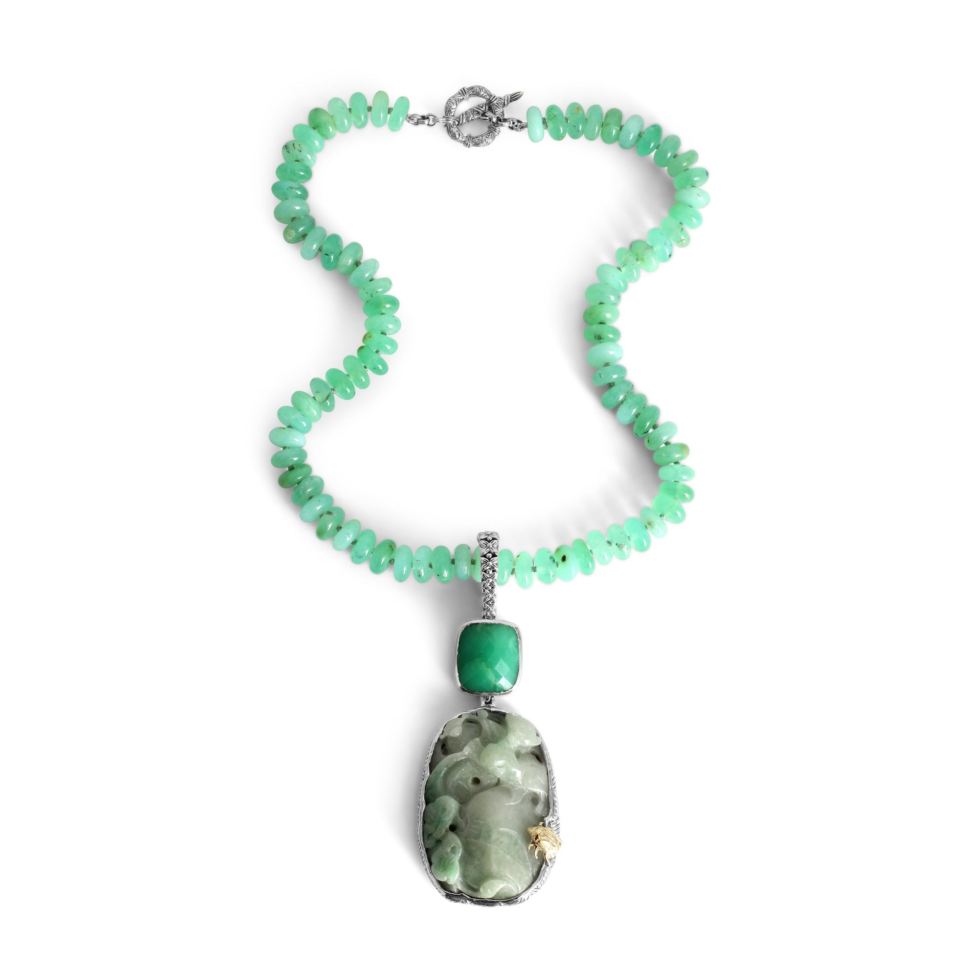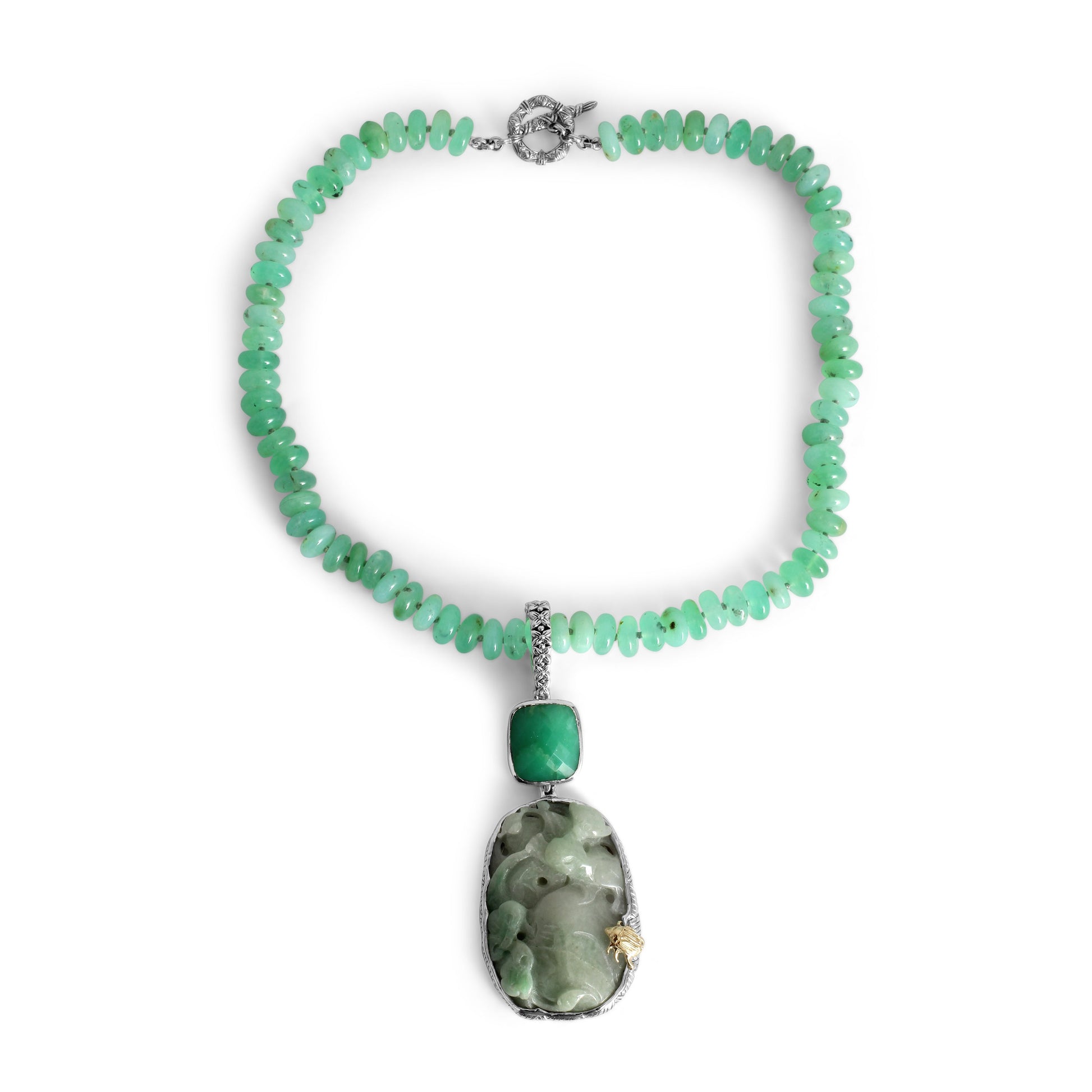 One of a Kind Vintage Hand Carved Jade Faceted Chrysoprase and Chrysoprase Bead Necklace in Sterling Silver with 18K Gold Adam