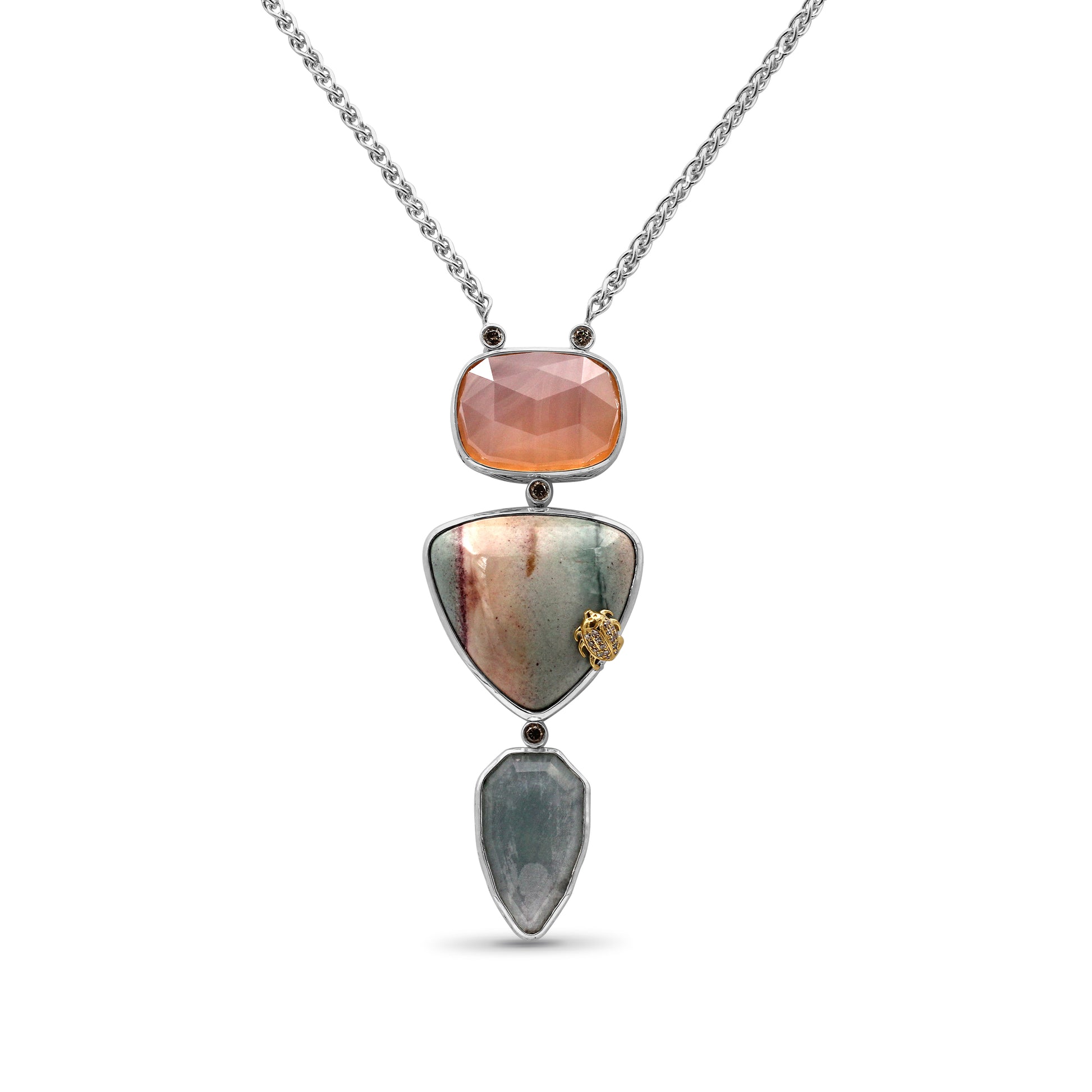 One of a Kind Smooth Sunset Jasper Facet Top Flat Back Pink Chalcedony Facet Top Natural Quartz Top Over Green Agate and 0.28ct Diamond Pendant in Sterling Silver with 18K Gold Diamond Pave Adam