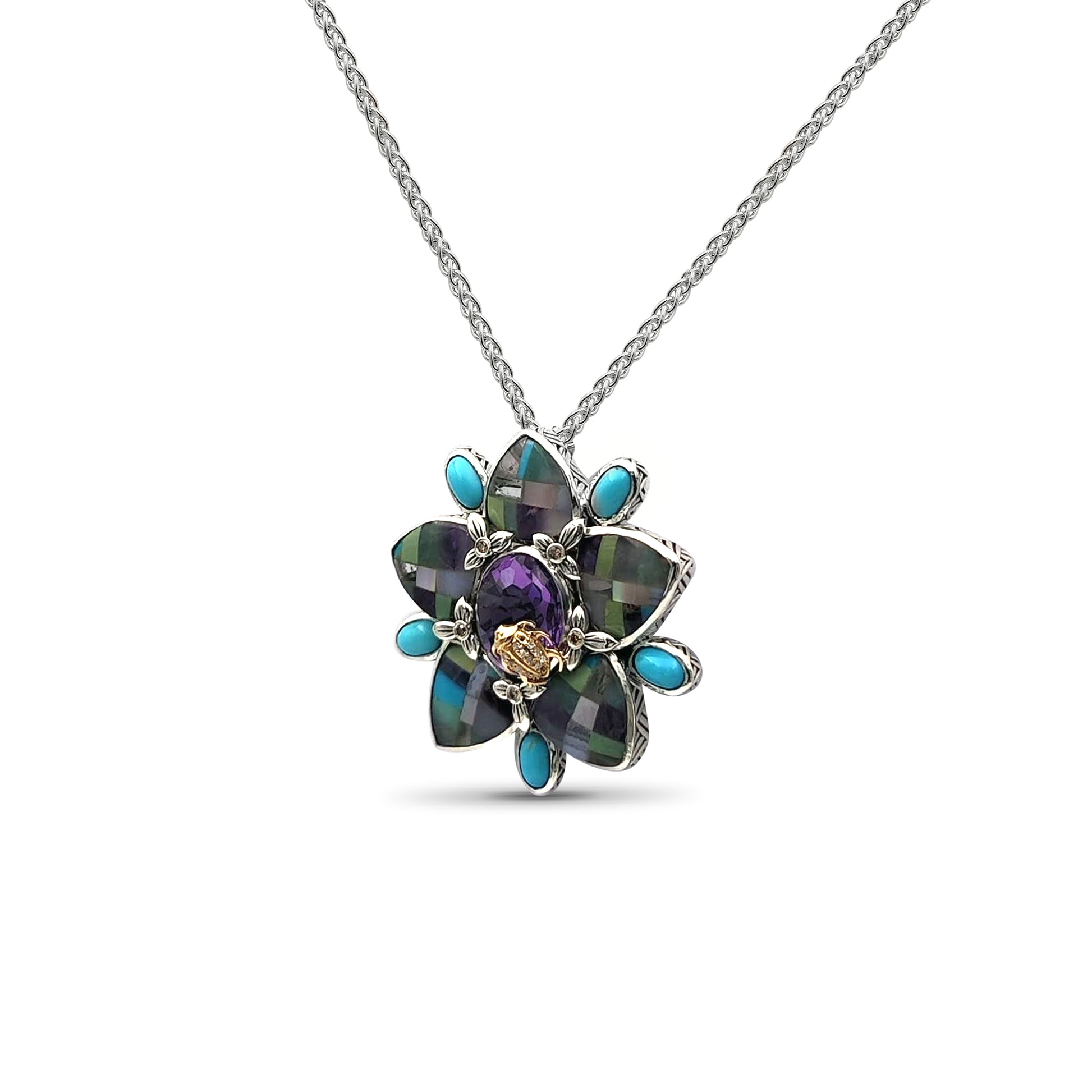 One of a Kind Pastel Color Mosaic Smooth Turquoise Facet Amethyst and Diamonds 0.10ct Pendant-Pin in Sterling Silver with 18K Gold Adam