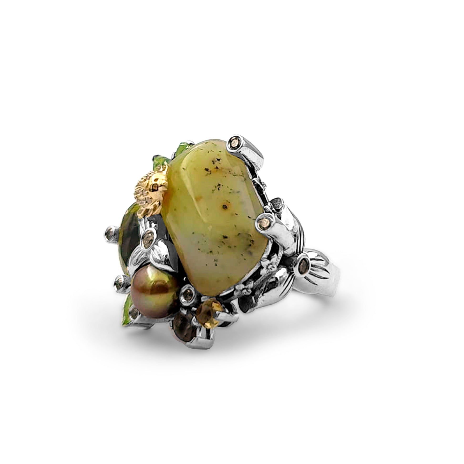One of a Kind Peridot Lemon Quartz Smooth Natural Chalcedony Cognac Quartz Brown Pearl and Diamond 0.24ct Ring in Sterling Silver with 18K Gold Diamond Pave Adam