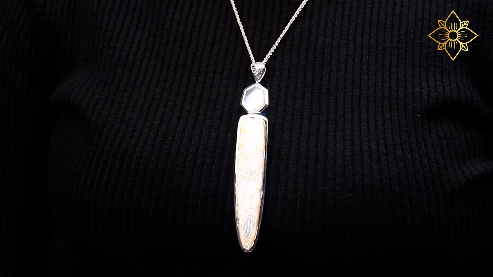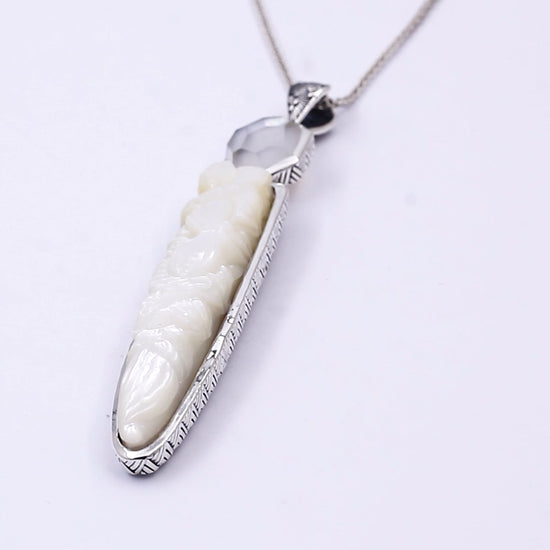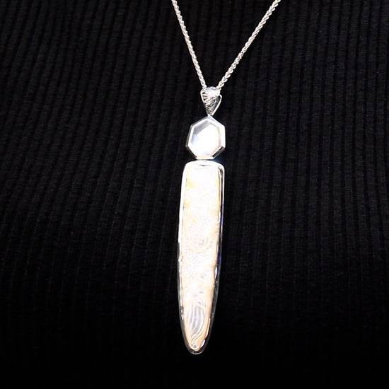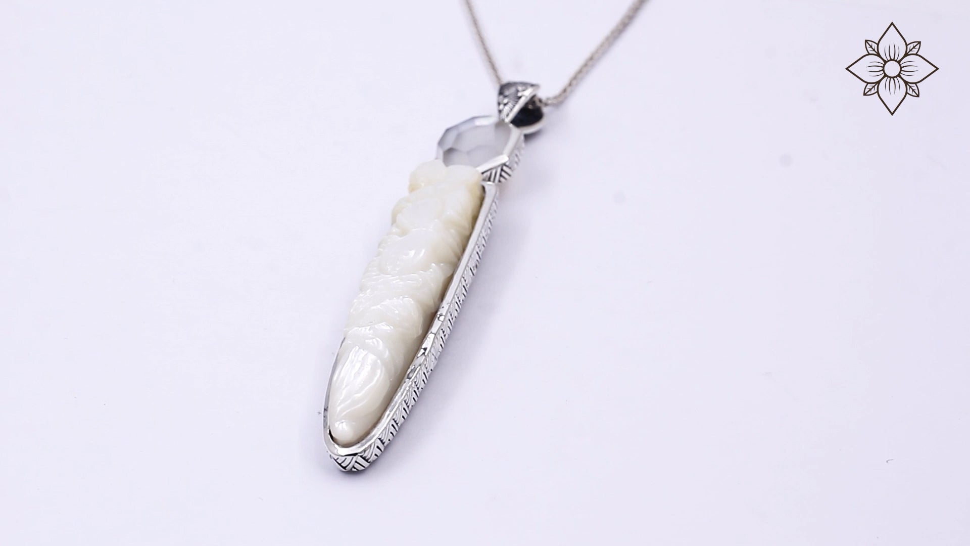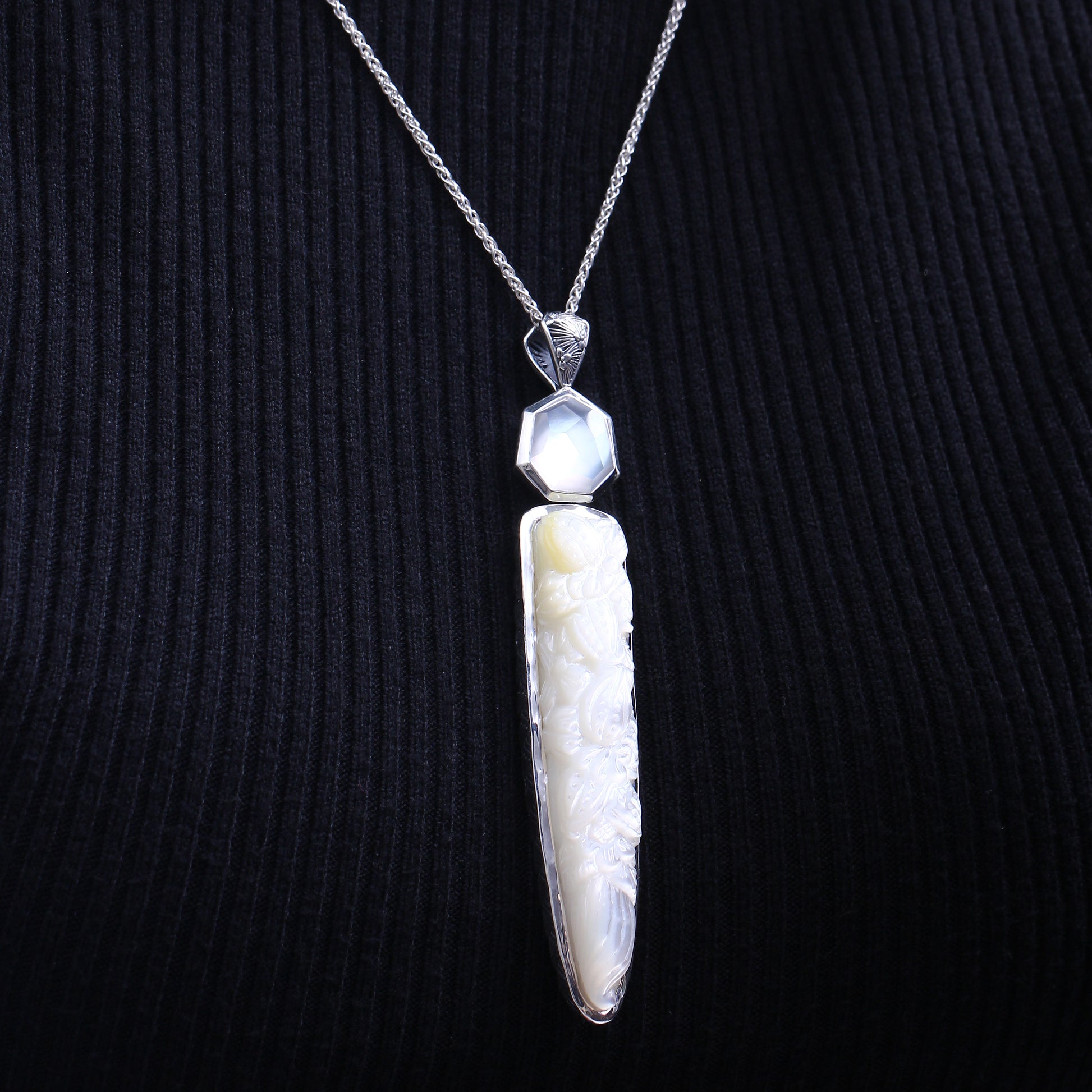 Carventurous 53.70ct Hand Carved Mother of Pearl and Faceted Natural Quartz Pendant in Sterling Silver