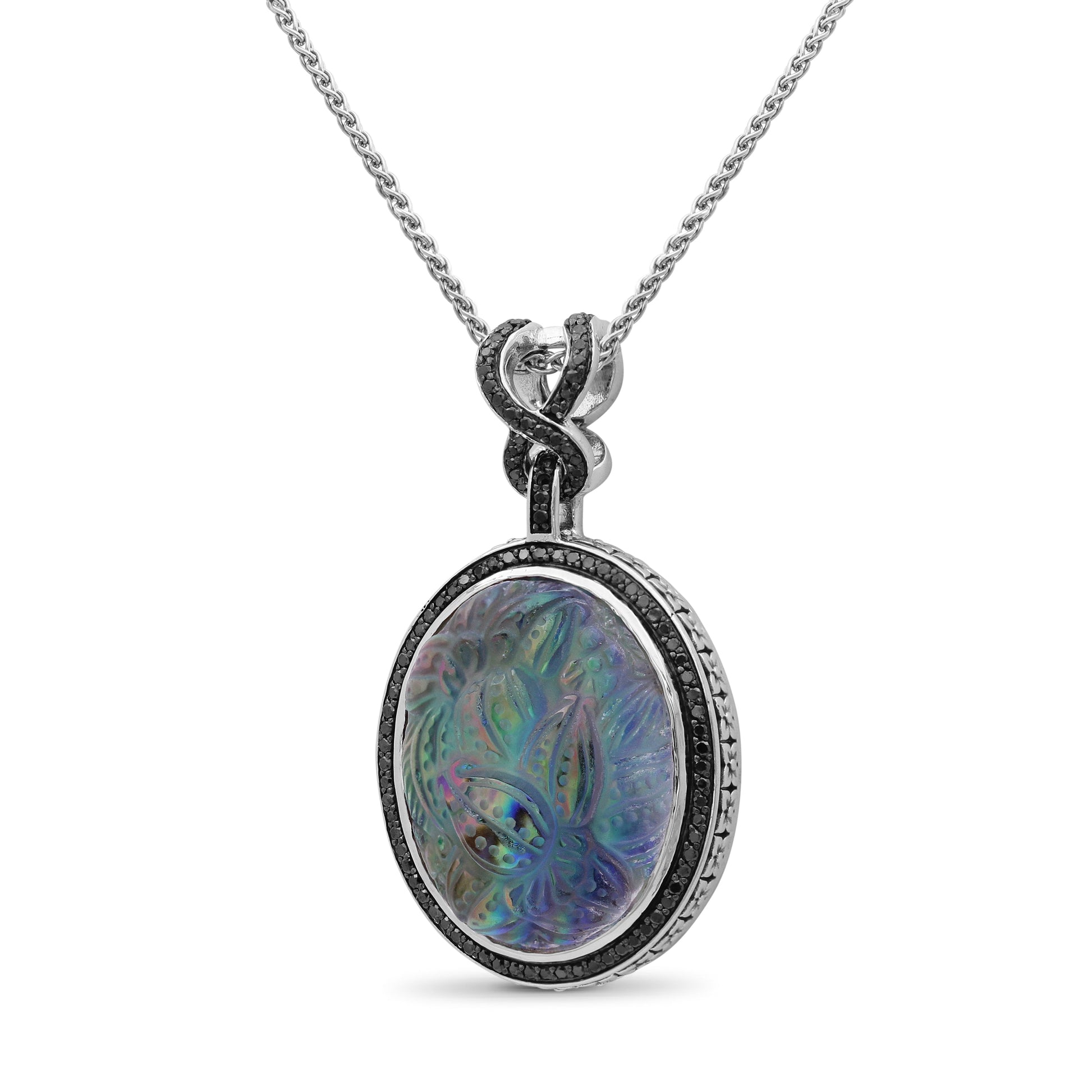 Carventurous Hand Carved Natural Quartz Abalone and Black Diamond 1.12ct Pendant in Sterling Silver