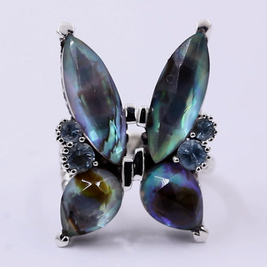Garden of Stephen Faceted Natural Quartz Abalone Labradorite and Swiss Blue Topaz Butterfly Ring in Sterling Silver