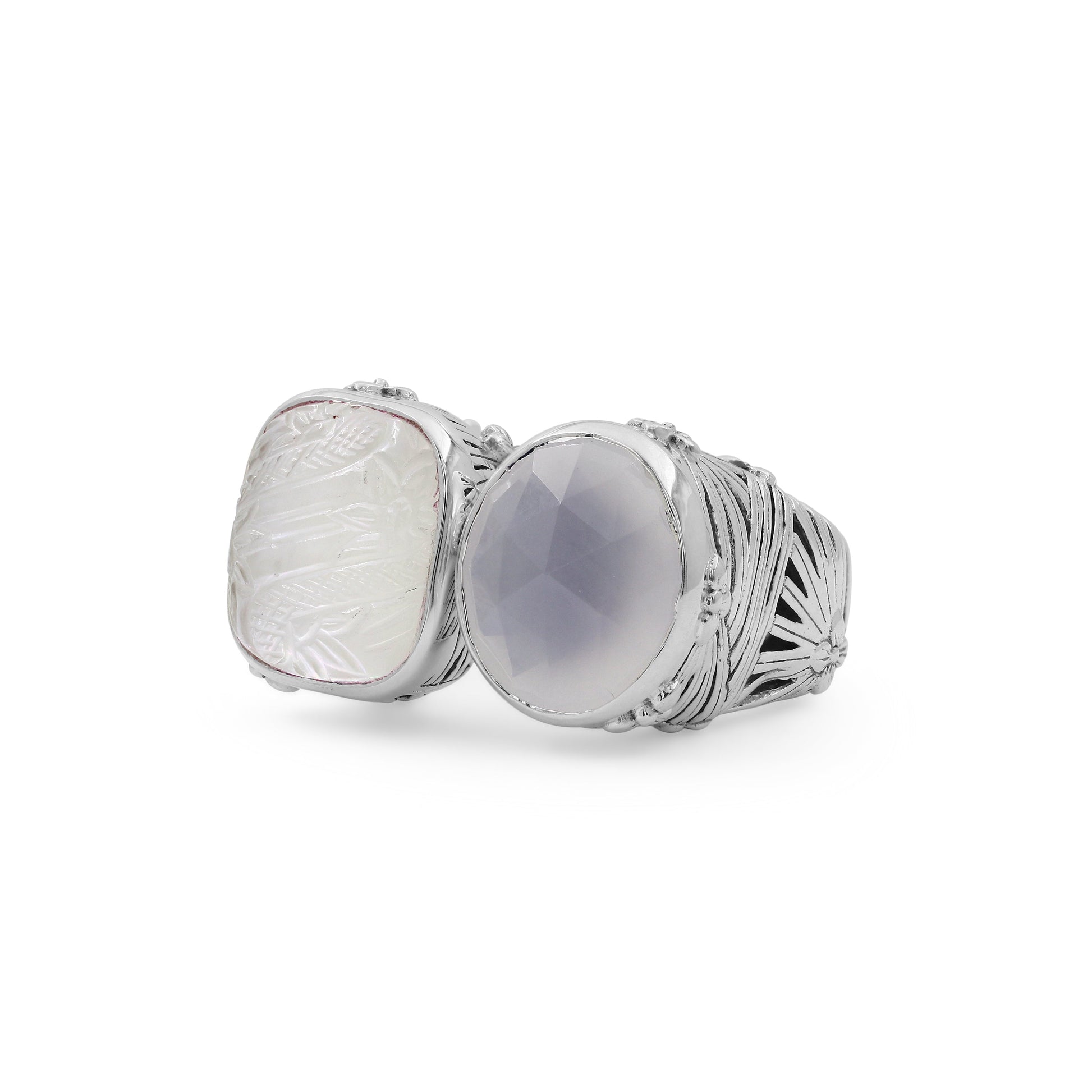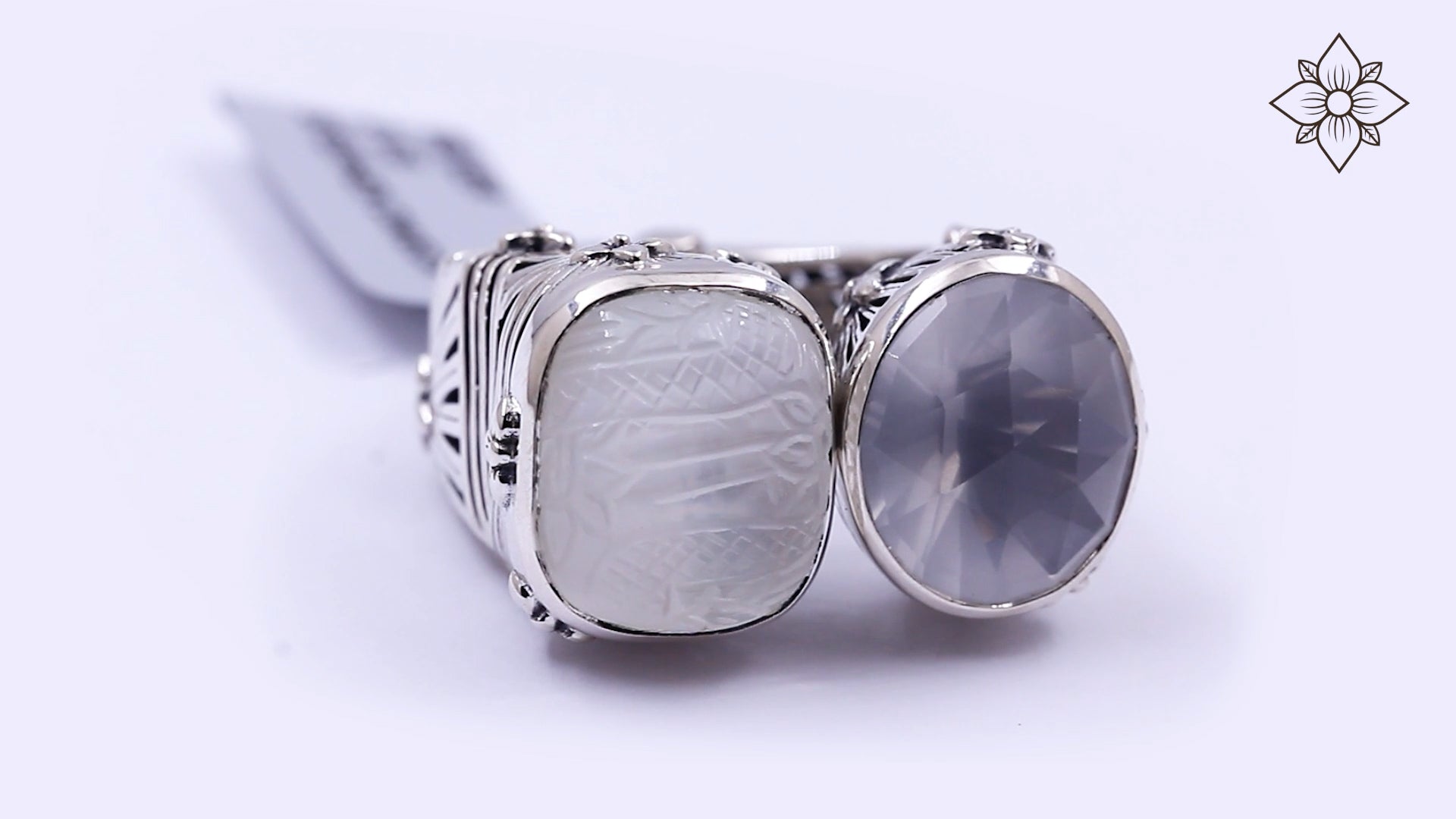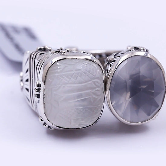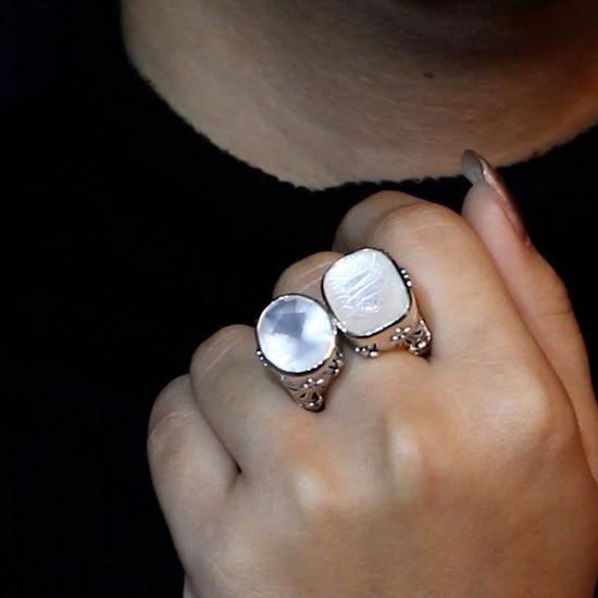 Carventurous Faceted Moon Quartz Hand Carved Natural Quartz and Mother of Pearl Open and Close Sunray Ring in Sterling Silver