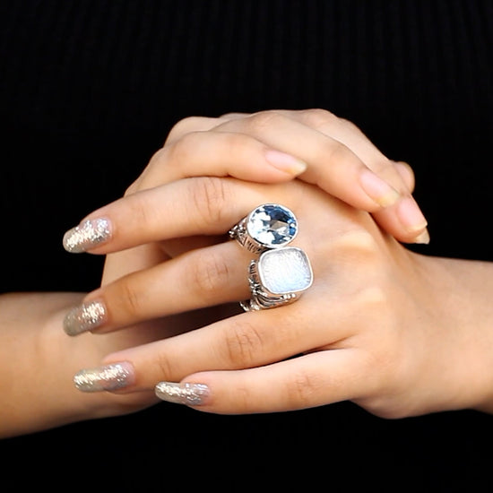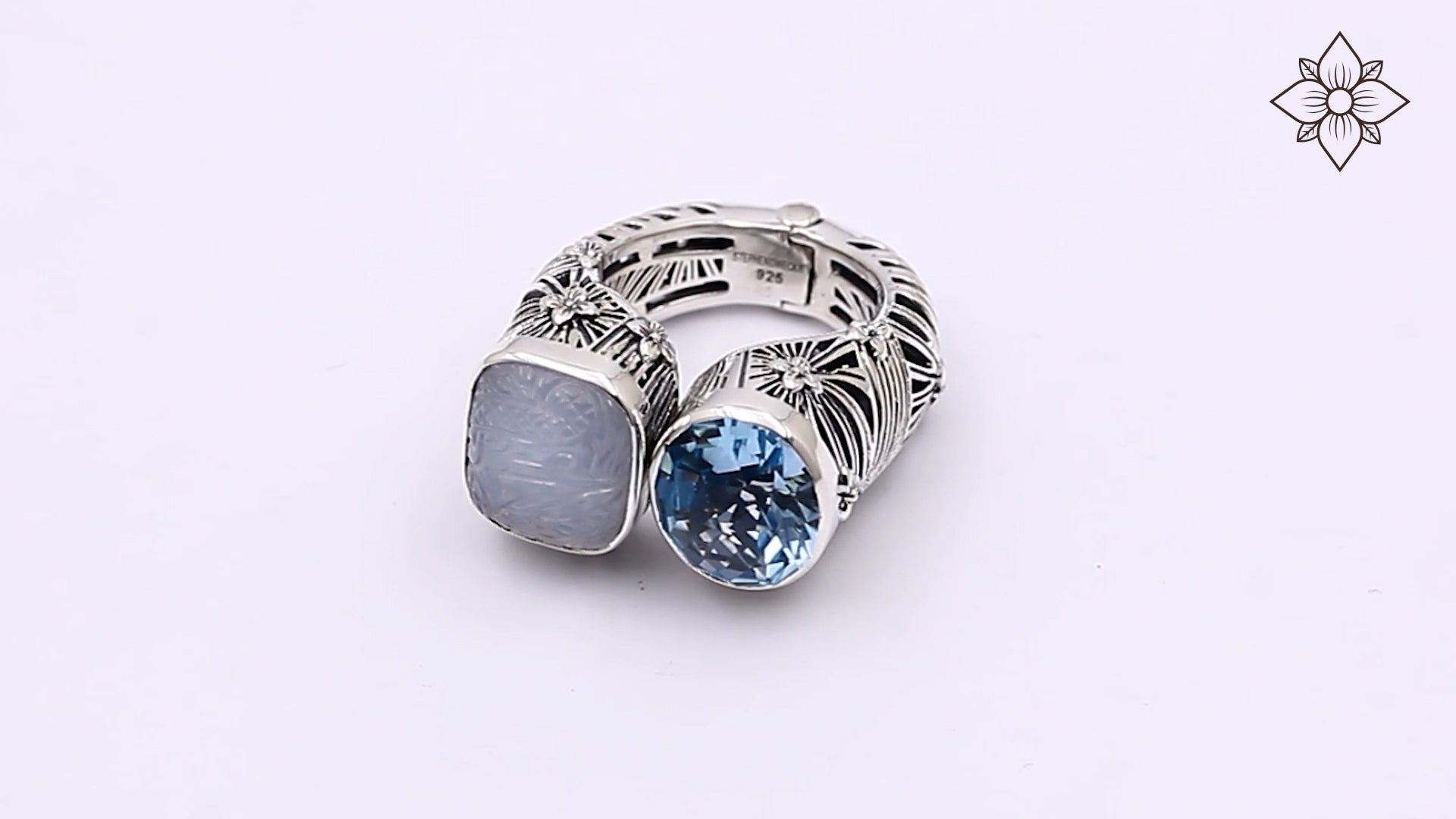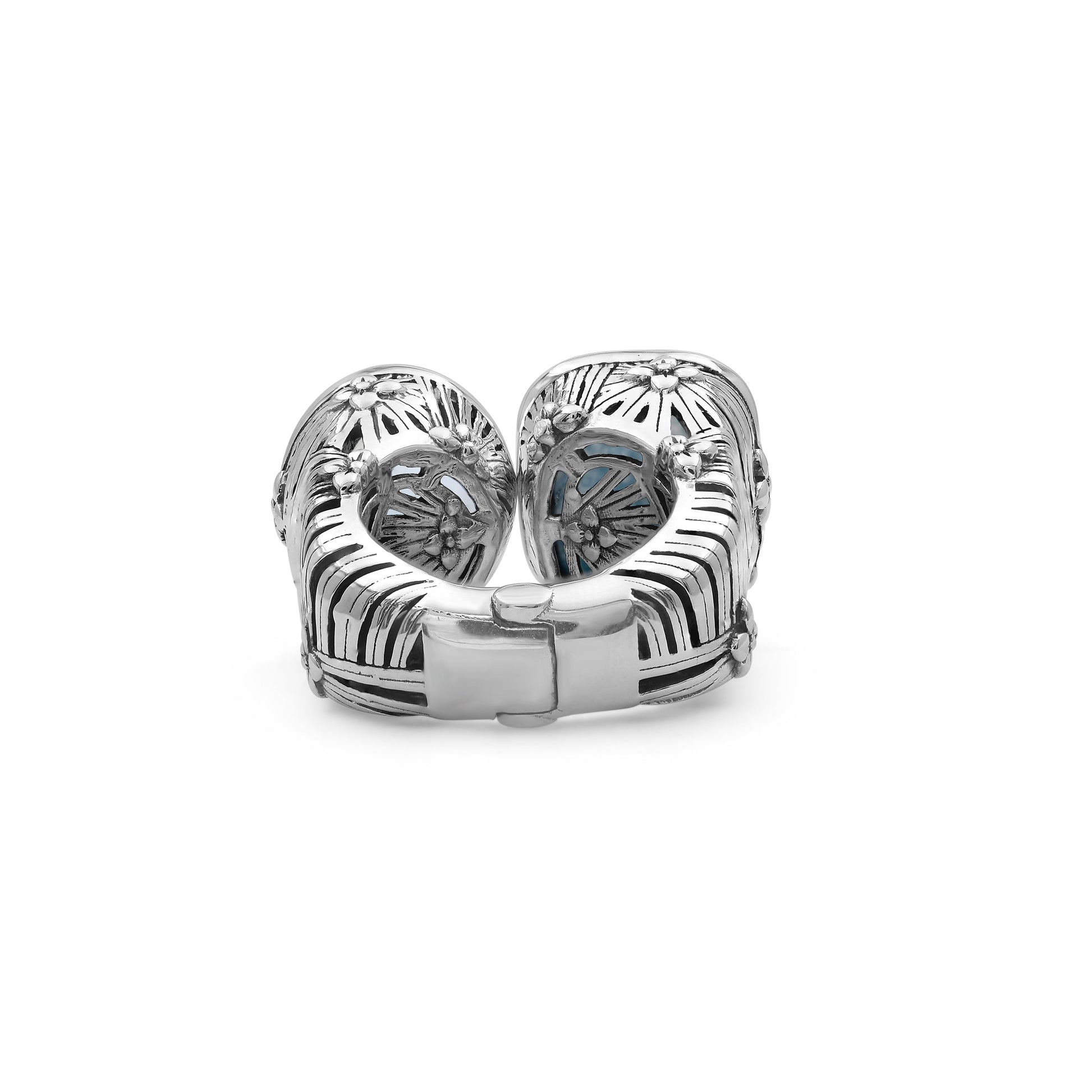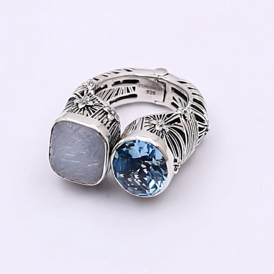 Carventurous Faceted Blue Topaz Natural Quartz Mother of Pearl and Green Agate Open and Close Sunray Ring in Sterling Silver